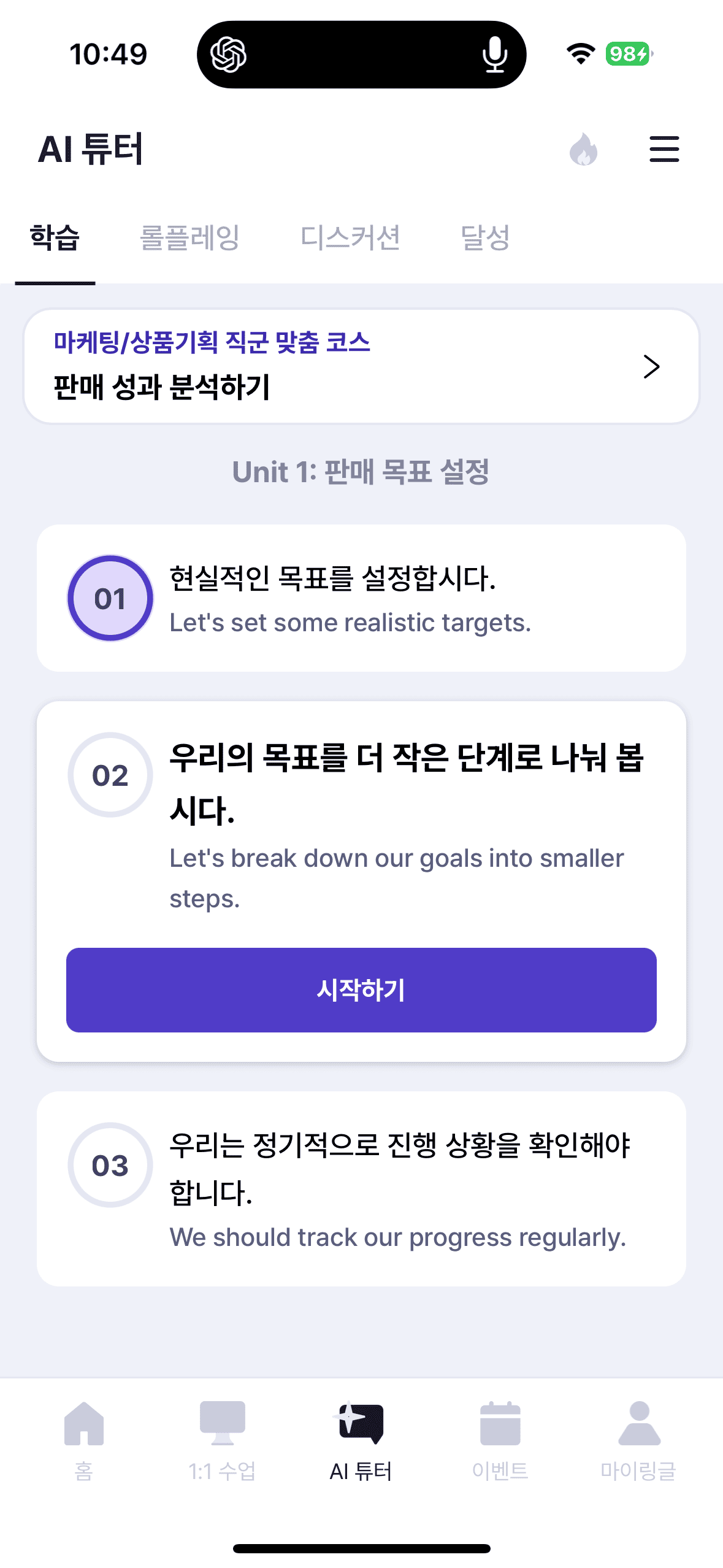 위와 같이 분야별로 나누어져 있고, 직무를 선택하면 가장 우측처럼 표현 공부를 우선합니다. AI 튜터와 대화 세션이 시작되기 전에 필수 표현을 공부하는 건데, 3~5 문장 정도를 공부하게 됩니다.