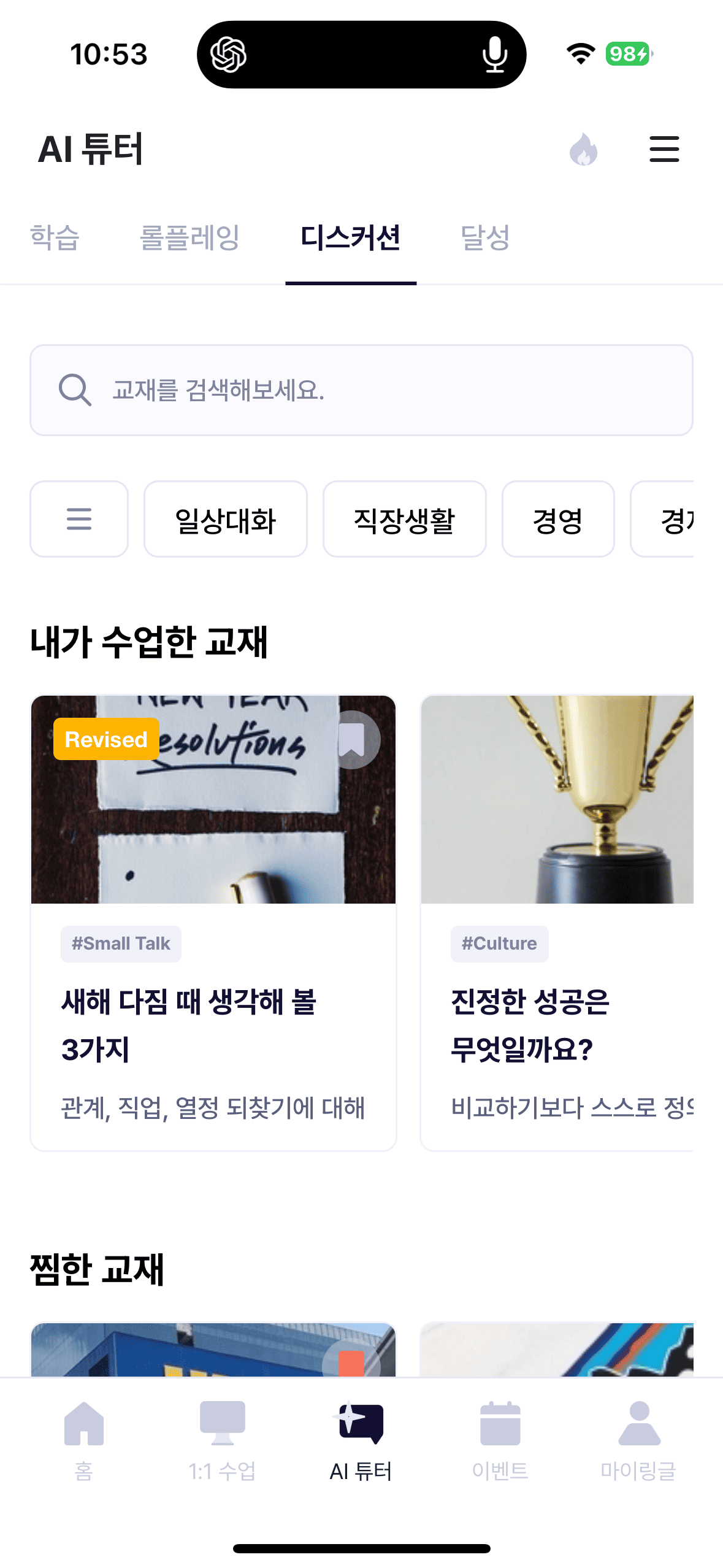 그래서 저는 보통 영어회화 수업을 진행하기 전후로 예복습을 링글 AI 디스커션으로 진행합니다. 확실히 혼자 말하는 것과 AI와 대화하는 것도 차이가 커서 말하는 게 정리되는 게 신기했습니다.
