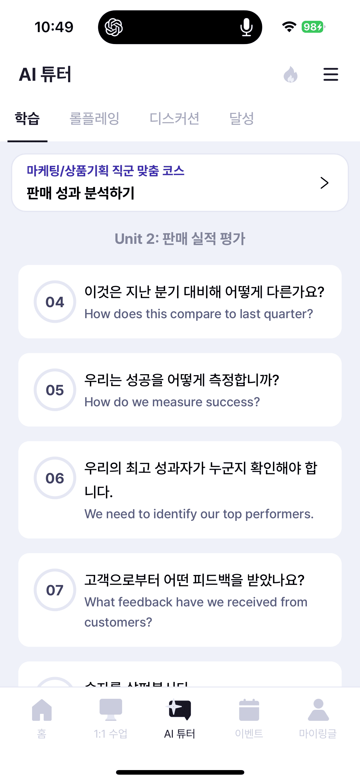 링글 AI 튜터 '학습' : 비즈니스 영어, 회화 끝판왕