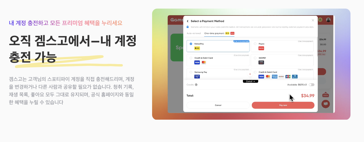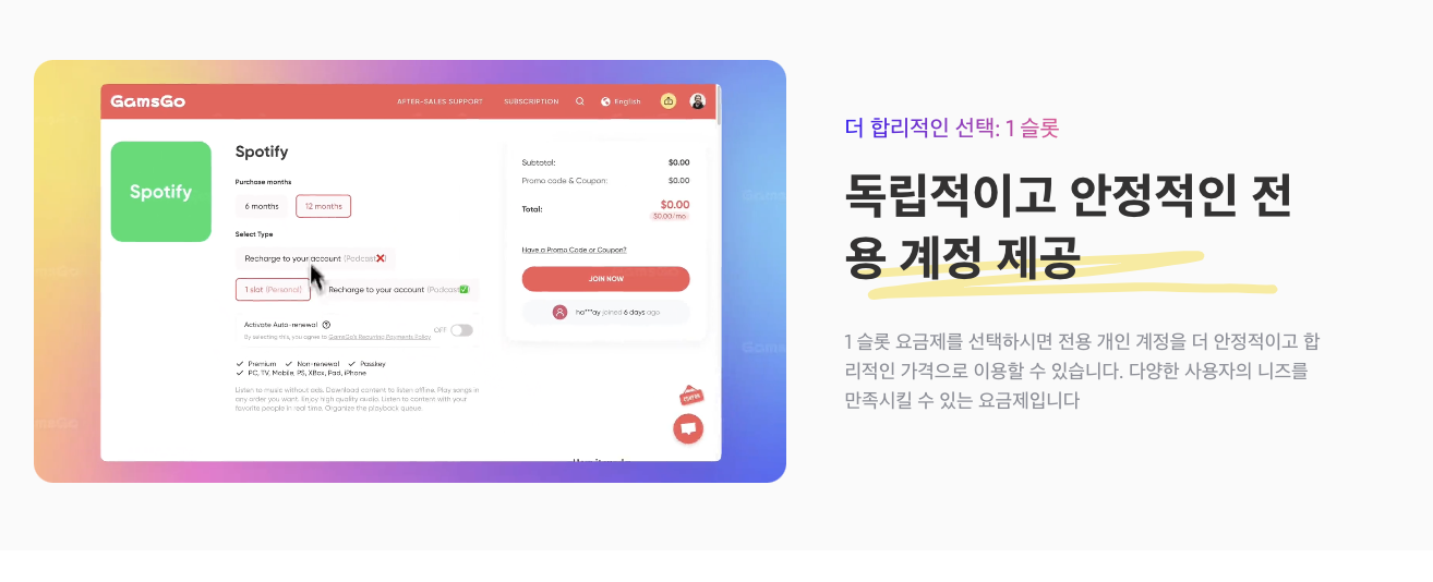 겜스고는 글로벌 구독 서비스 할인 플랫폼입니다. 넷플릭스, 유튜브 프리미엄, 디즈니 플러스는 물론이고, 스포티파이까지 다양한 구독권을 정가보다 훨씬 저렴하게 제공합니다.