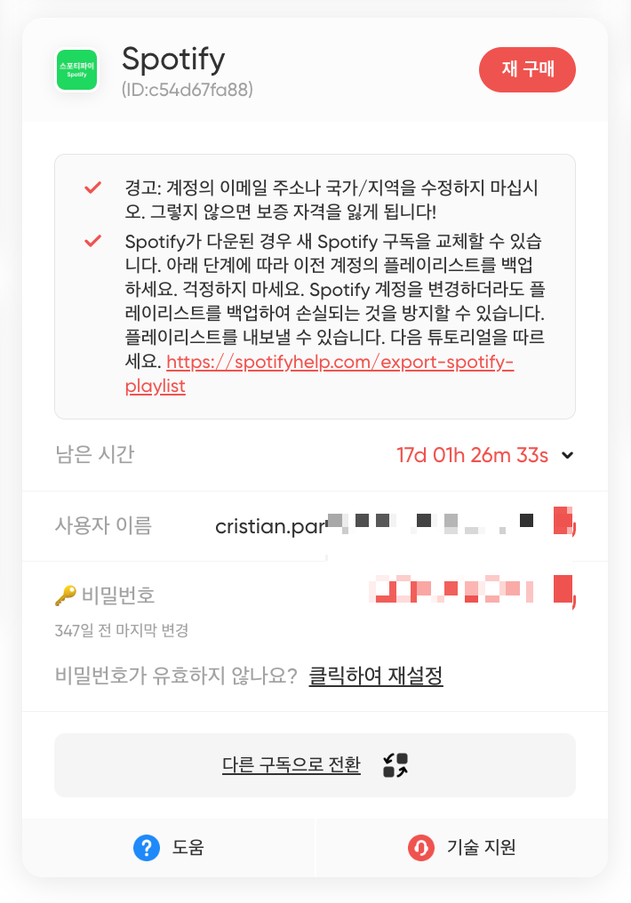 스포티 파이를 기존에 사용하셨다면, 본인 계정 충전 서비스로 이용하시는걸 추천드리고 아니시면 1개 계정에서 구매월을 선택하여 이용해보세요! 다만 본인 계정 충전 서비스는 비용이 조금 올라갑니다! - 쿠폰 코드 적용(XABFQ)