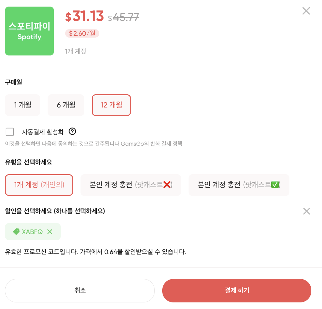 중요한 건, XABFQ 코드를 기입하시면 스포티파이 뿐만 아니라 겜스고의 모든 플랫폼을 할인 받을 수 있습니다!
