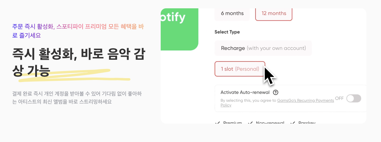 스포티 파이를 기존에 사용하셨다면, 본인 계정 충전 서비스로 이용하시는걸 추천드리고 아니시면 1개 계정에서 구매월을 선택하여 이용해보세요! 다만 본인 계정 충전 서비스는 비용이 조금 올라갑니다! - 쿠폰 코드 적용(XABFQ)