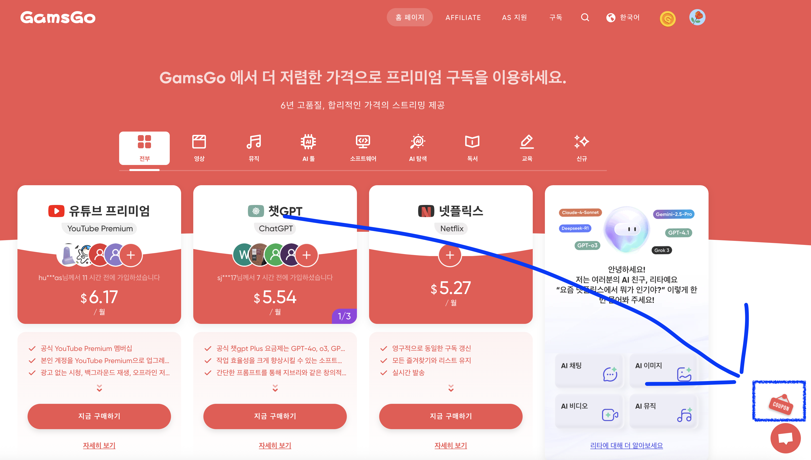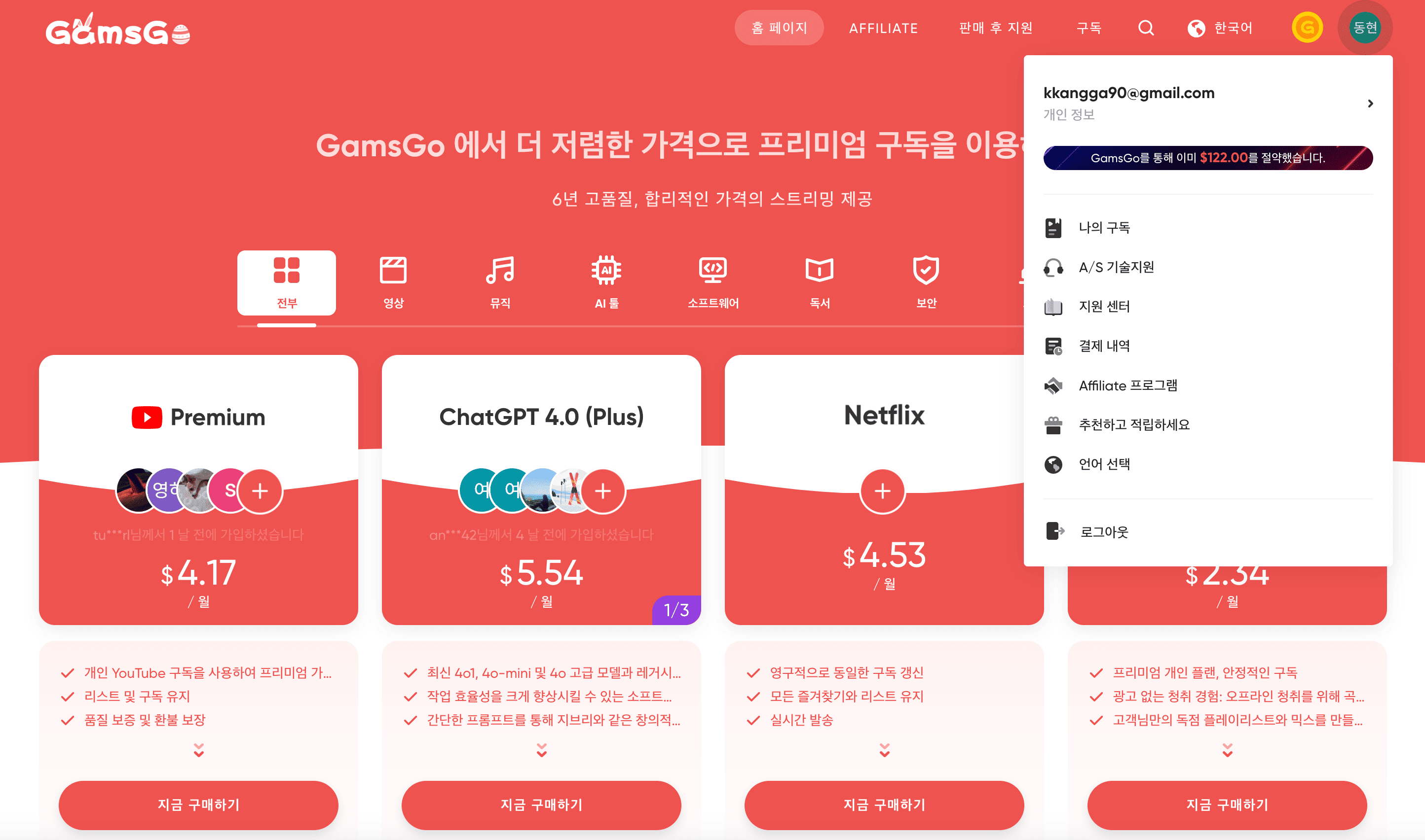 겜스고에는 보통 알고 있는 모든 구독 플랫폼들이 다있다고 보시면 됩니다. 챗GPT, 넷플릭스, Gamma AI 등 실생활에 사용하는 AI는 모두 있습니다.