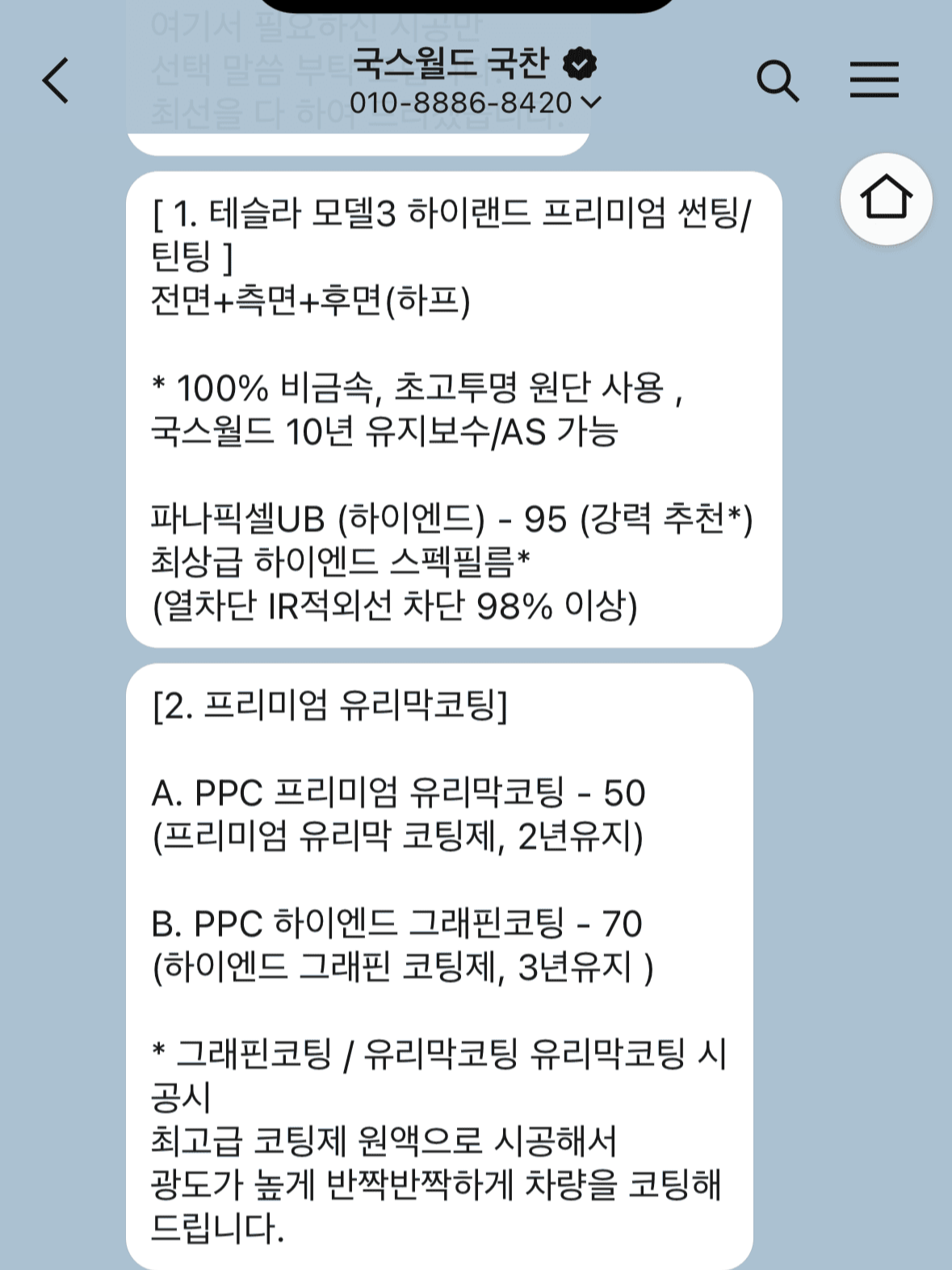 가격은 항상 바뀔 수 있으니, 정확한 가격은 국스월드 카카오톡으로 문의하시면 되겠습니다. 저는 틴팅과 PPF B타입과 하이패스까지 해서 142만 원을 지불했습니다.