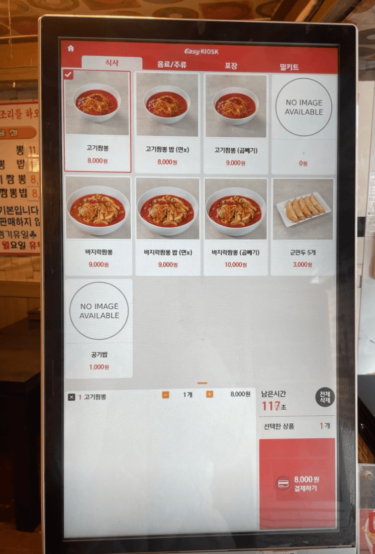 들어가면 주문은 키오스크에서 합니다. 고기짬뽕, 짬뽕밥 바지락 짬뽕 군만두까지 있고요. 밀키트도 팔고 있습니다. 역시 맛집이라는 생각이 듭니다. 중국집에서 자체 밀키트 파는 건 처음 봤습니다.