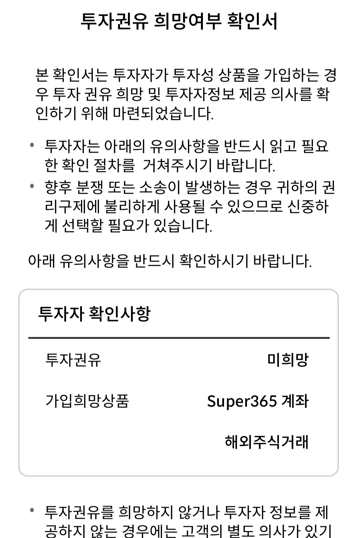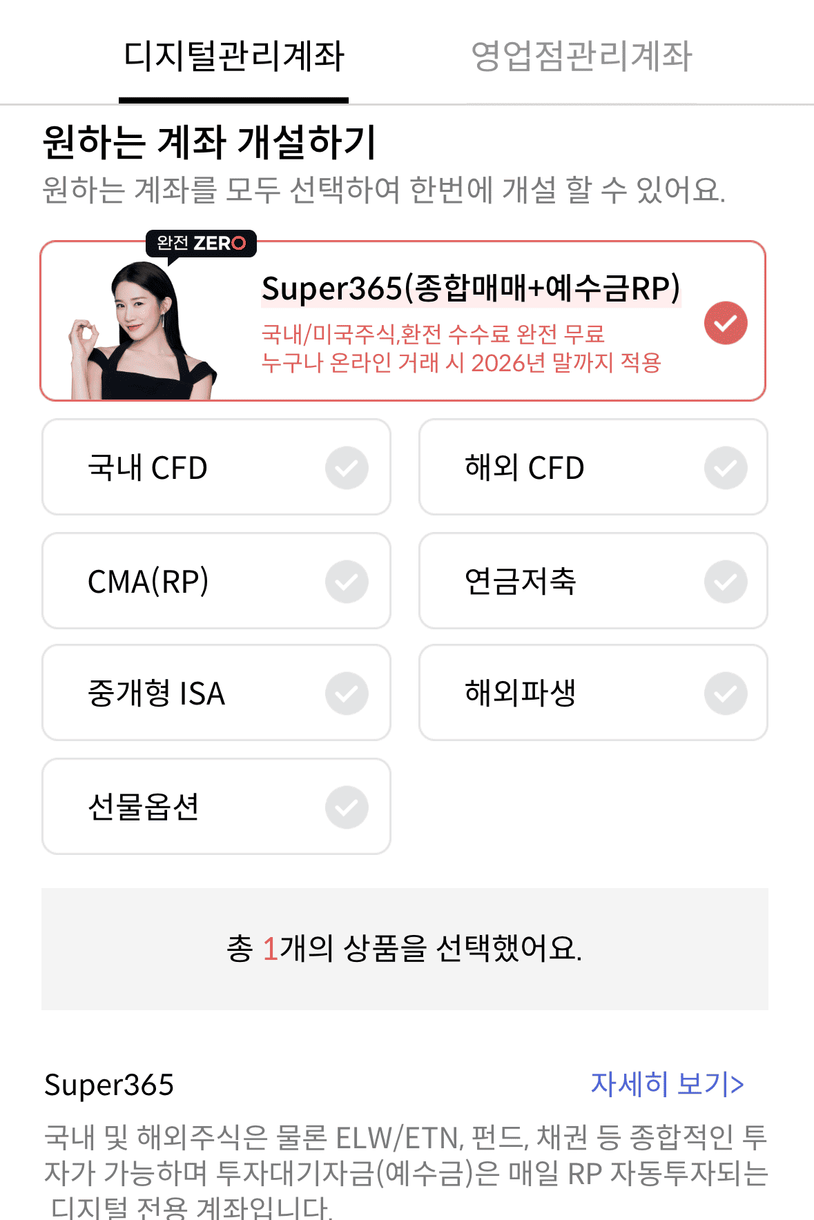 - 슈퍼365 계좌 선택 및 약관 동의 → 다양한 계좌 옵션 중 "슈퍼365 계좌" 선택 후, 필수 약관 확인 및 동의