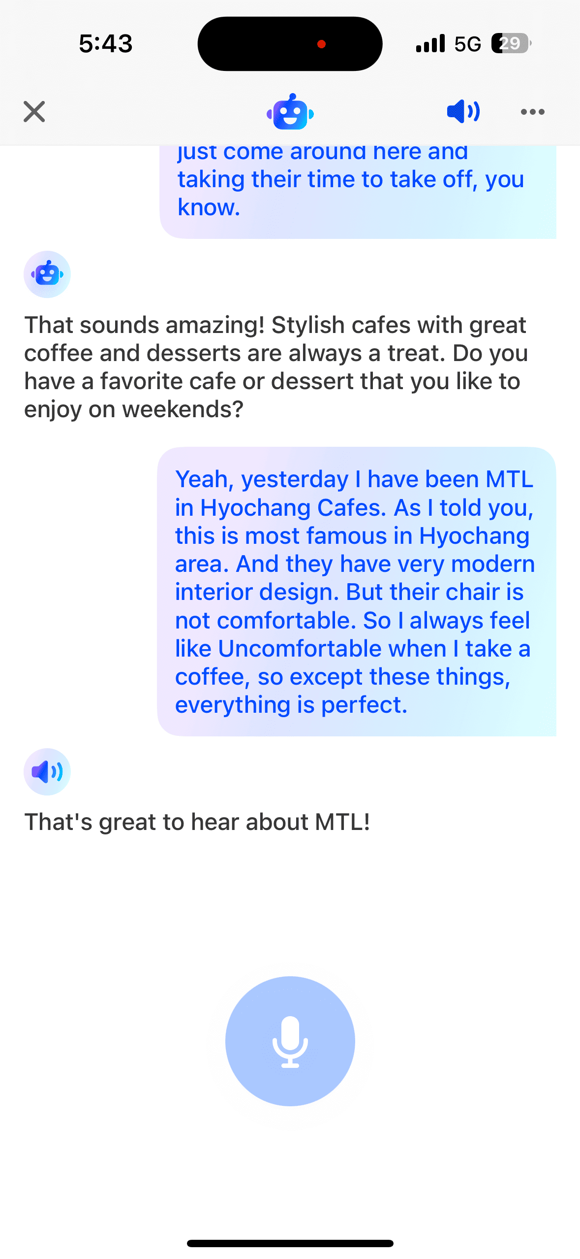 가령, 오늘 있던 일들을 읊어서 말하는 것도 당연히 혼자서도 할 수 있지만 AI 튜터와 대화한다면 훨씬 풍성해지기 마련입니다. 저는 항상 오늘 있던 일들을 AI 튜터와 대화하며 데일리로 활용하고 있습니다.