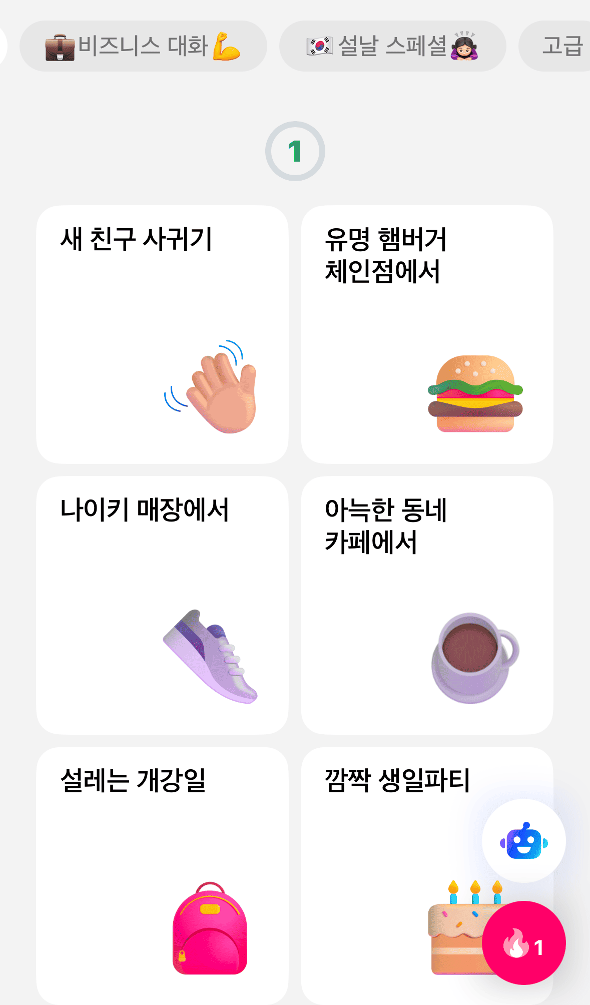 스픽의 AI 기능 중 상황극 기능은 일상생활, 비즈니스, 여행 등 다양한 상황에 입각하여 상황극 및 시뮬레이션으로 영어연습을 할 수 있습니다. 이 부분이 제가 가장 마음에 드는 기능입니다.