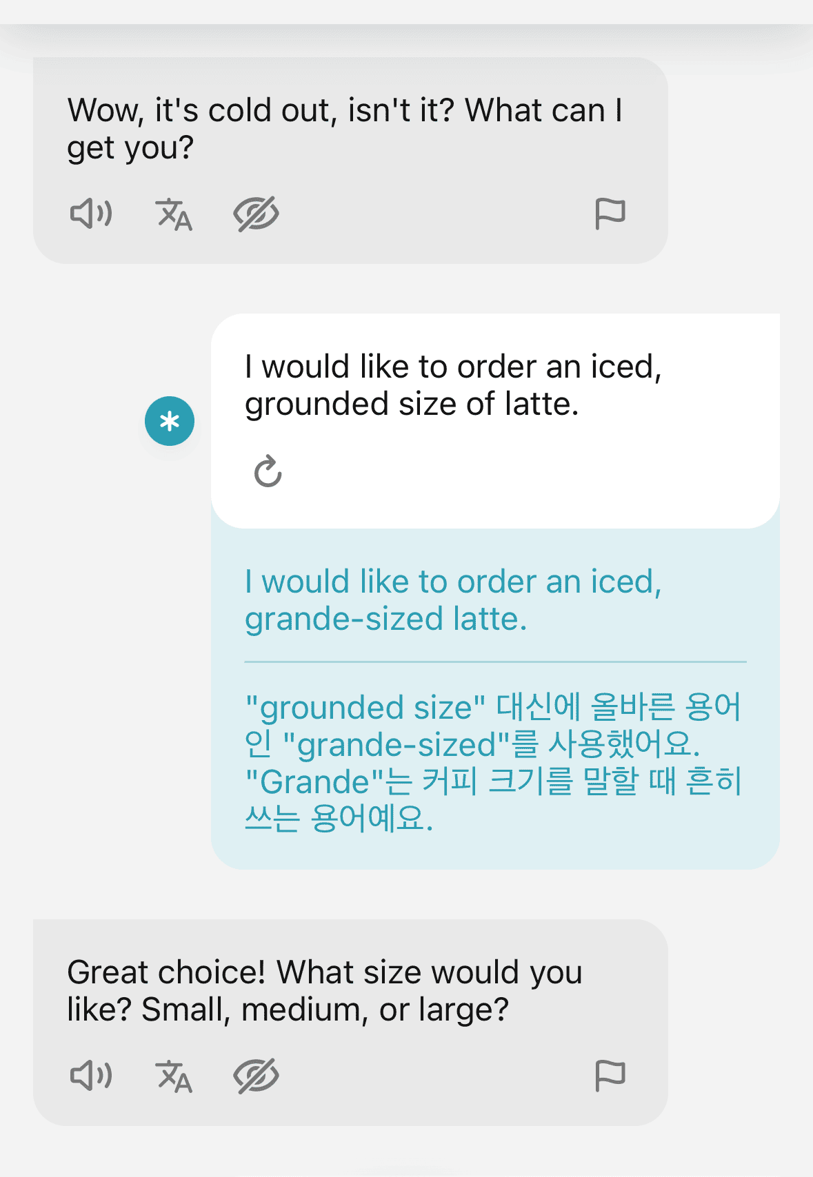 스픽 AI 튜터는 챗지피티의 언어모델을 기반으로 하기 때문에, 원어민 수준 그 이상으로 교정해 주고 자연스럽게 문장을 고쳐주는 게 큰 장점이라고 생각합니다.