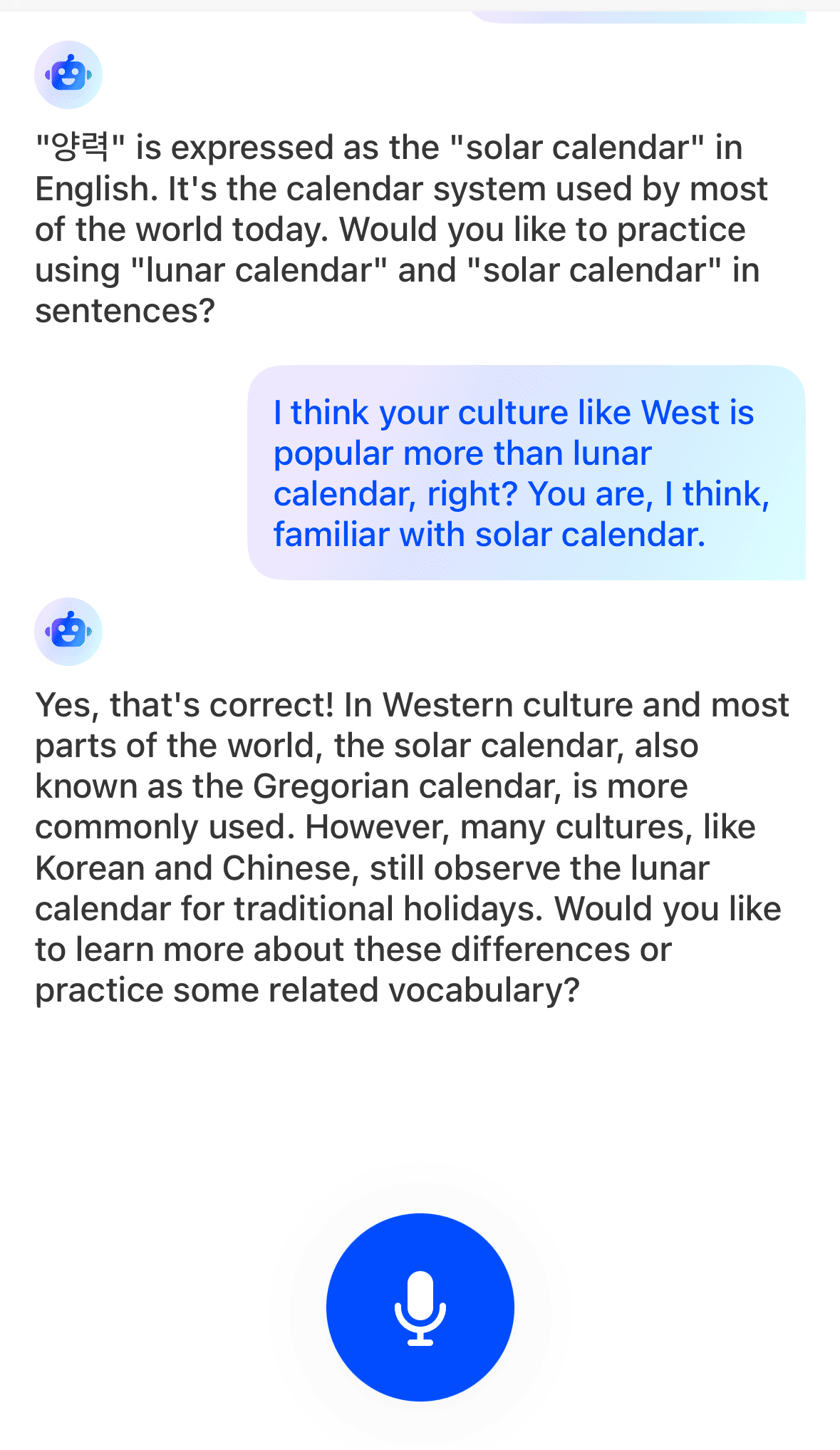 그러면 AI에게 물어봅니다. "How can I express '음력' in English?", 그러면 AI가 이렇게 쭉 답변해 줍니다. lunar Calendar가 누군가에게는 쉬운 단어이지만, 대부분은 익숙지 않죠.