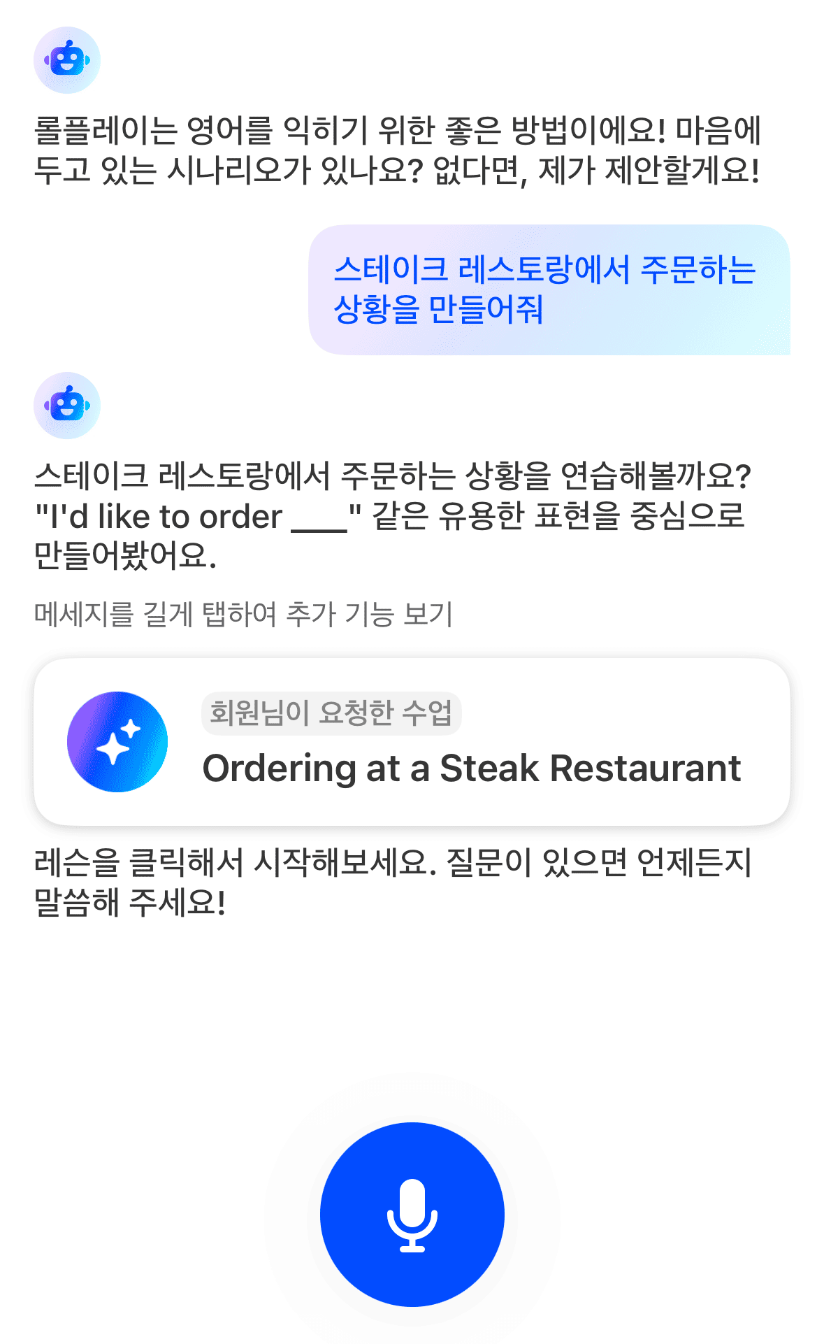 반대로, AI 대화 기능에서 수업을 만들어낼 수도 있습니다. 레스토랑에서 주문하기를 연습하고 싶다면, 바로 요청하면 레슨을 만들어줍니다. 정말 마음에 드는 기능입니다.