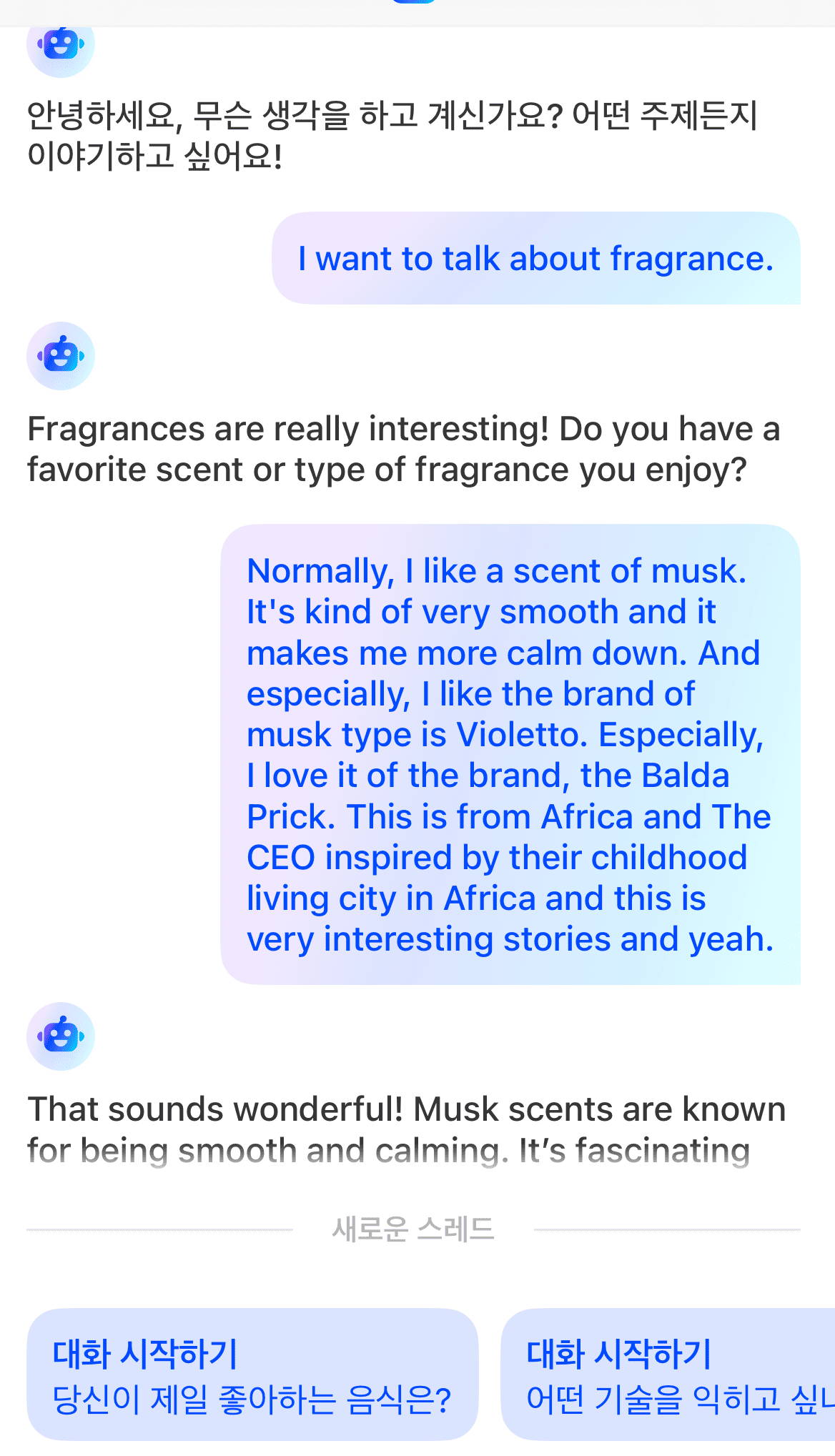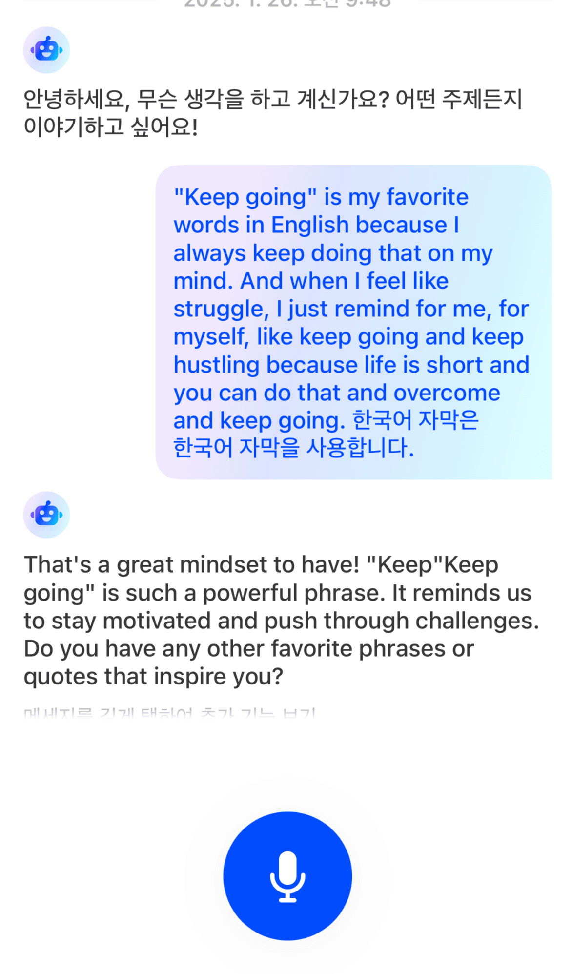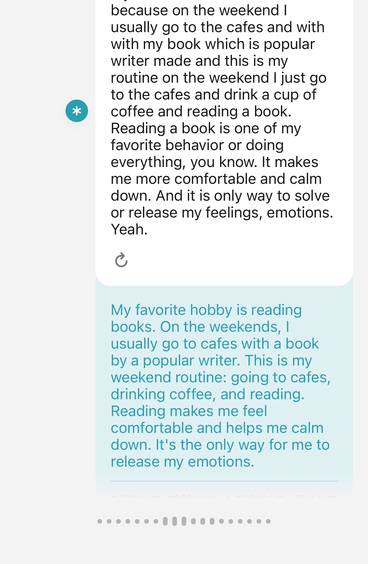 이렇게 대화를 이끌어주고, 제가 영어로 아무말 대잔치를 하면, 친절하게 영문으로 수정하여 제안해줍니다. 보통 머리에서 안나와도 얘기를 막하다보면, 나중에 이렇게 멋드러지게 수정해줍니다.