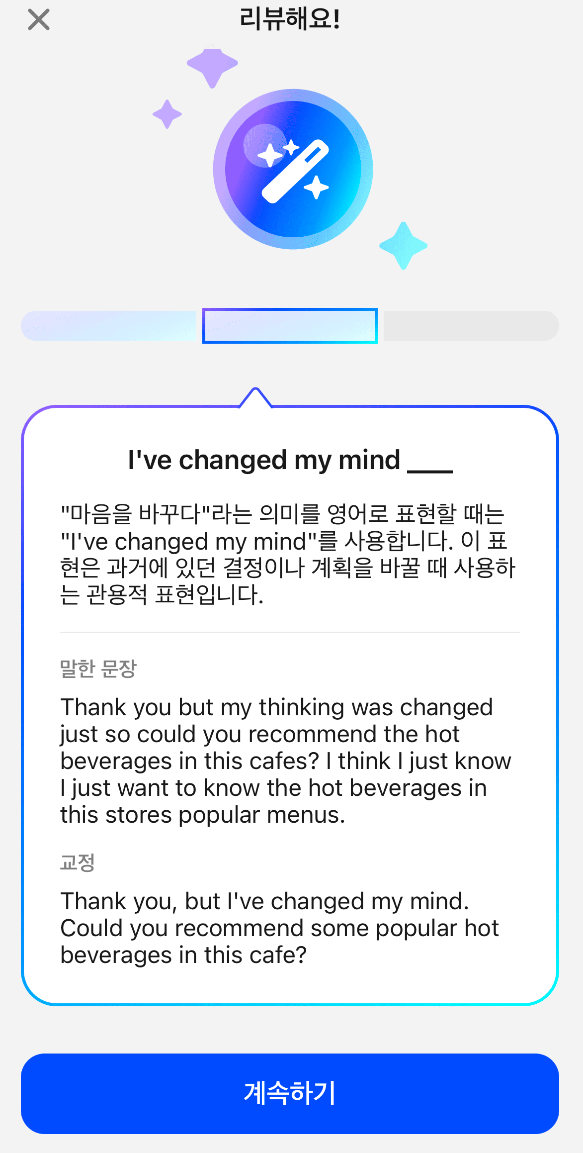 두 번째 리뷰 수업은 "I've changed my mind _" 구문이네요. 스픽에서 영어를 뱉을 때는 실수하는 걸 두려워하지 않고 말하다 보니, 이런 작은 실수들도 잘 캐치해서 수업을 만들어줍니다.