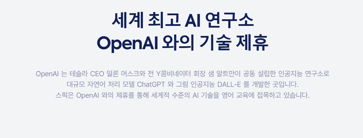 스픽에 대해 간단히 설명드리자면, AI를 기반으로 한 영어 학습 플랫폼입니다. AI 기반이 궁금하신 분들도 계시겠지만, 요즘 OPEN AI의 Chat gpt가 많이 상용화되어, 익숙하신 분들이 많으리라 생각됩니다.