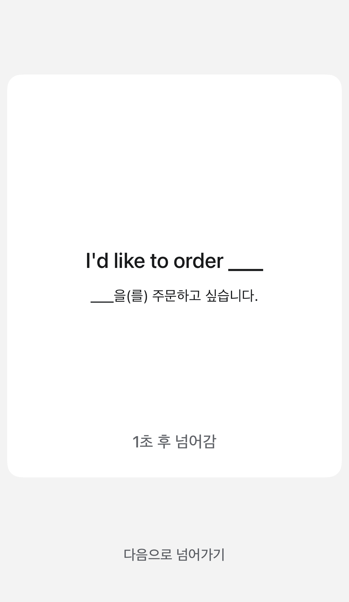 스마트 리뷰는 내가 수업 들었던 것들을 기반으로 수업을 만들어주는데, 위에서 추천해 줬던 상황과 비슷하게 구문 연습을 시켜줍니다.