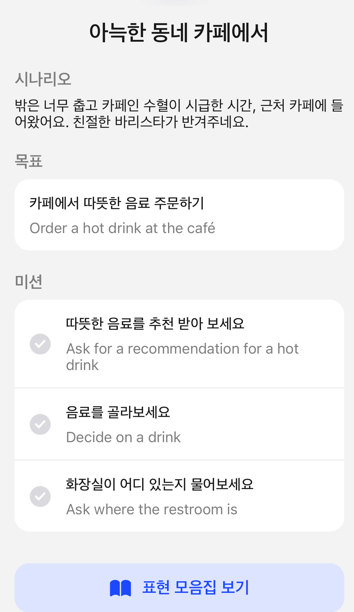 그러면 이렇게 3가지 미션이 보입니다. 따뜻한 음료 주문하기, 음료 고르기, 화장실이 어딘지 물어보기입니다. 프리토킹처럼 자유롭게 대화를 하면서, 3가지 미션을 수행하면 됩니다. 정말 놀랍죠.