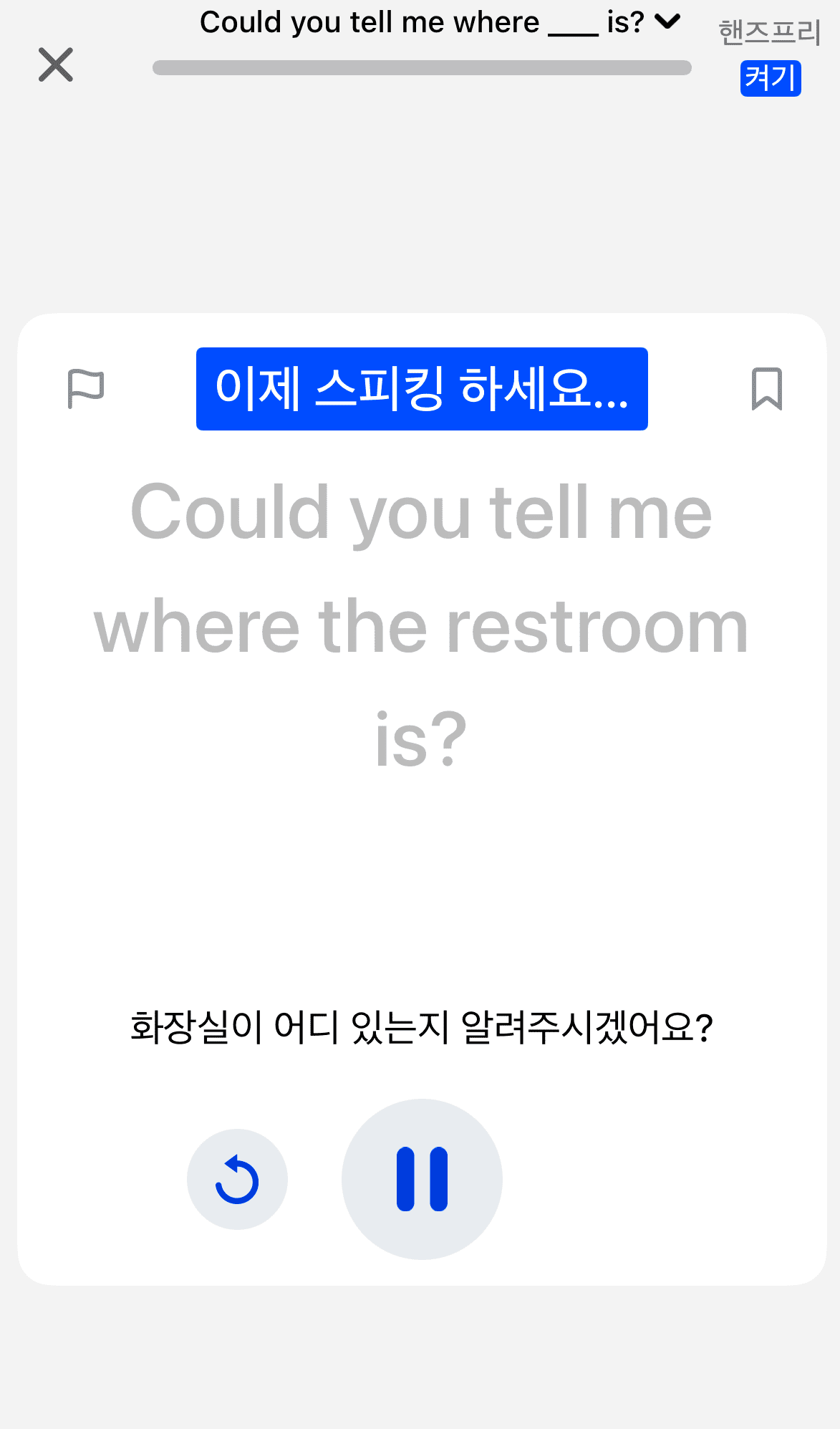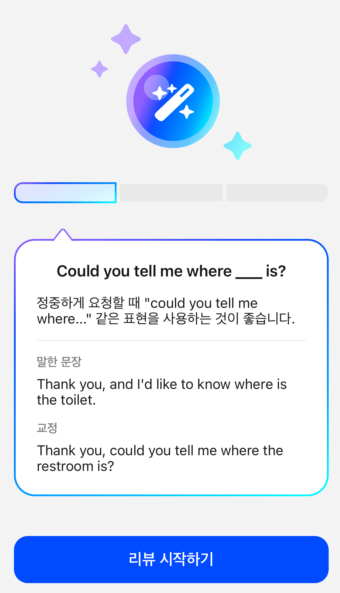 스픽 AI가 리뷰수업을 제안해 줍니다. "Could you tell me where _ is?" 구문을 연습해 보라고 합니다. 이렇게 배운 문장은 생각보다 내 것이 쉽게 되더라고요.