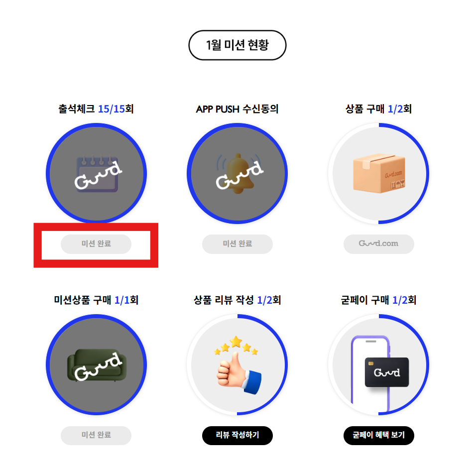 매월 1일이 되면, 위 이미지처럼 6개의 미션 이벤트가 시작됩니다. 15번 출석하면서 매일 200원~250원씩 받는 '출석체크'부터 굳닷컴의 간편 결제 서비스를 활성화하려는 듯 보이는 '굳페이 구매' 미션까지 있습니다.