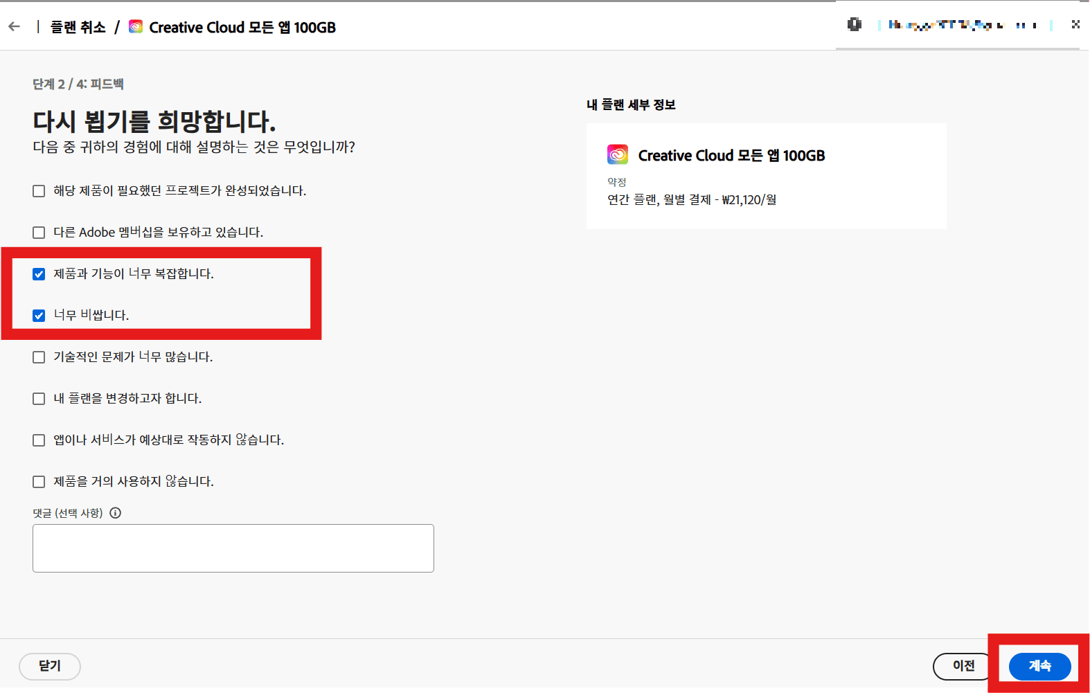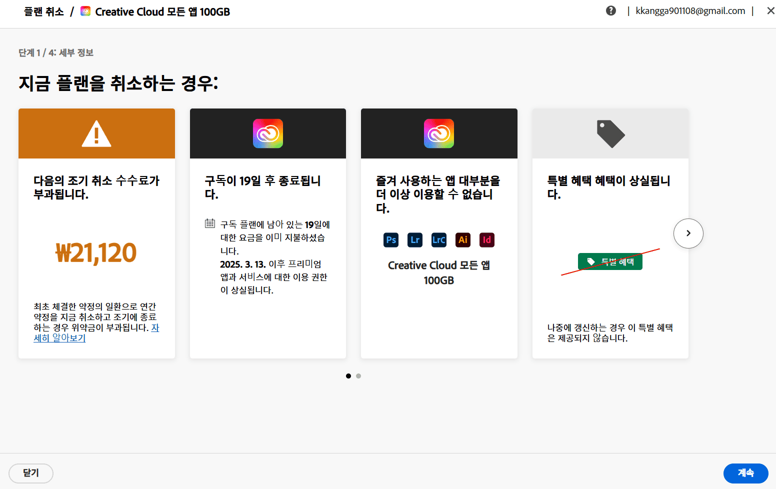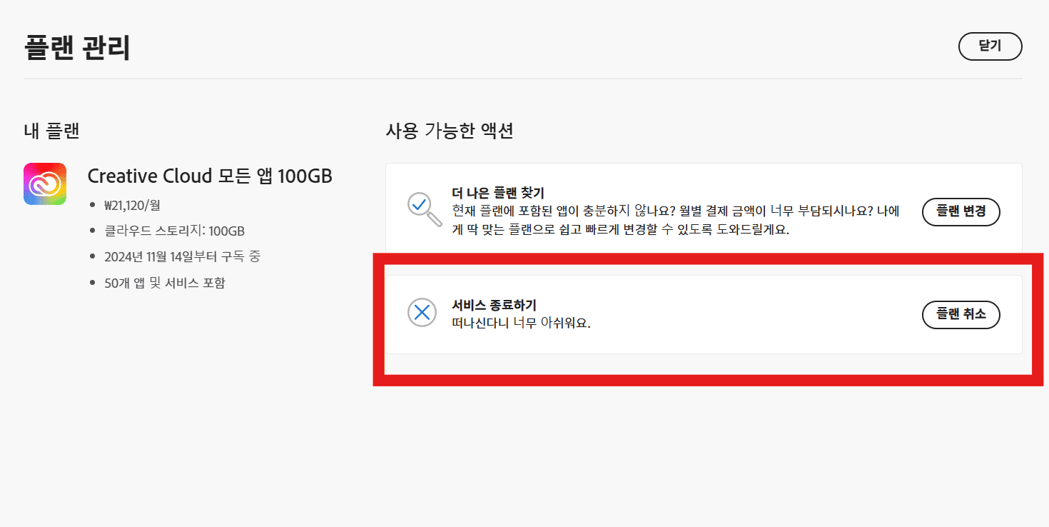 플랜 관리에서 구독 취소를 누르게 되면, 우측과 같은 창이 뜹니다. 이런 창이 뜨더라도 바로 구독이 종료되는 것이 아니니 걱정하지 마시고, 제가 드린 스크린샷에 맞춰 잘 따라오세요.