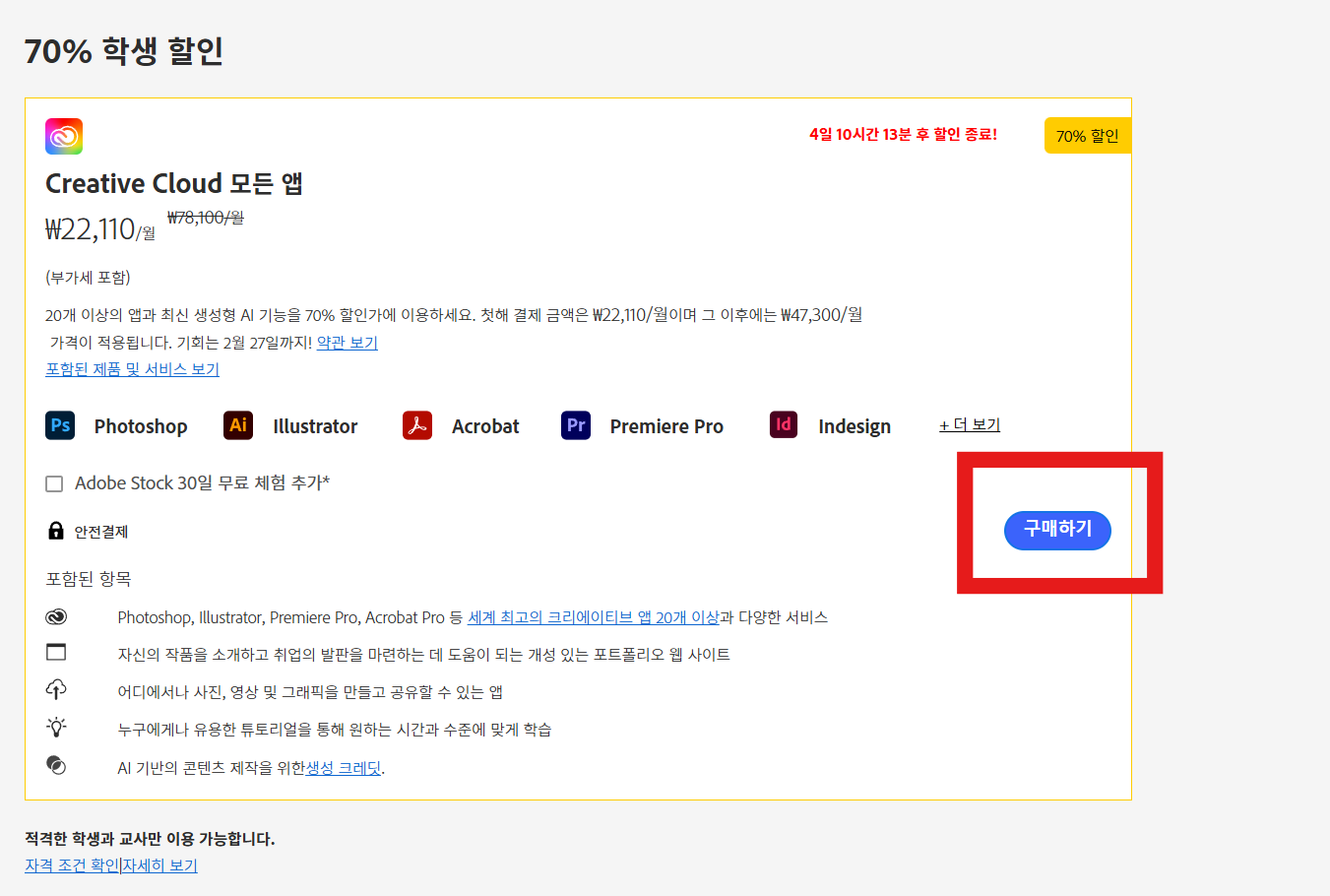 - 학생 구독: 월 2만 2천 원 (어도비의 모든 앱 사용 가능)