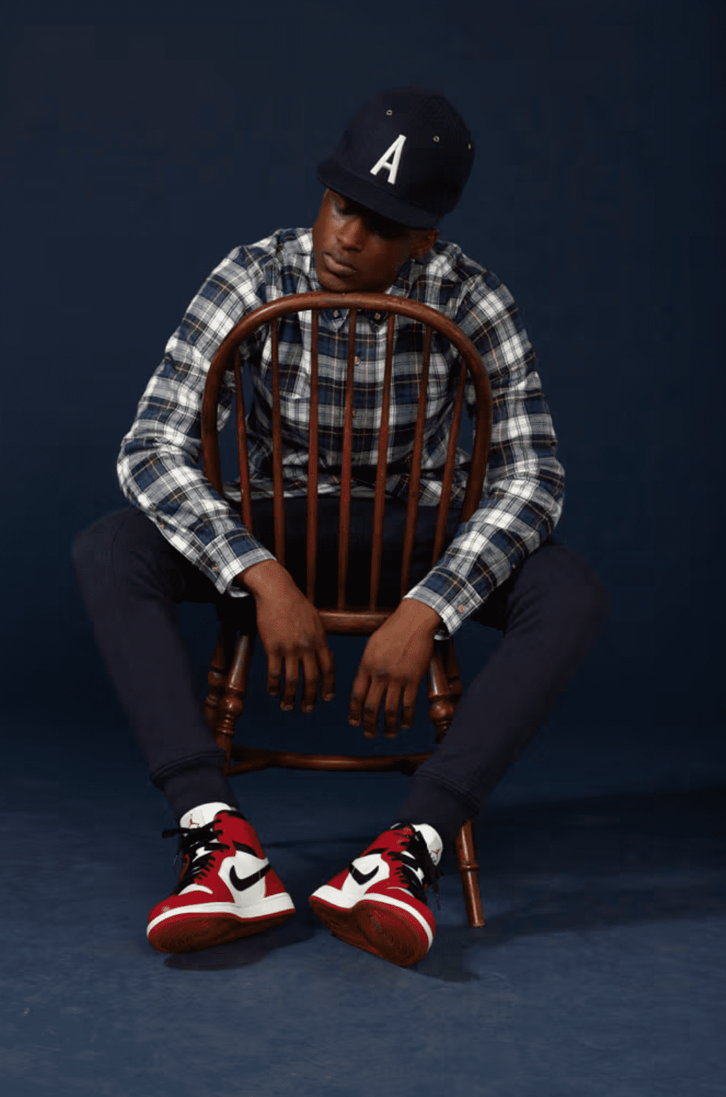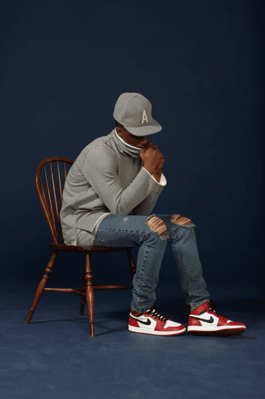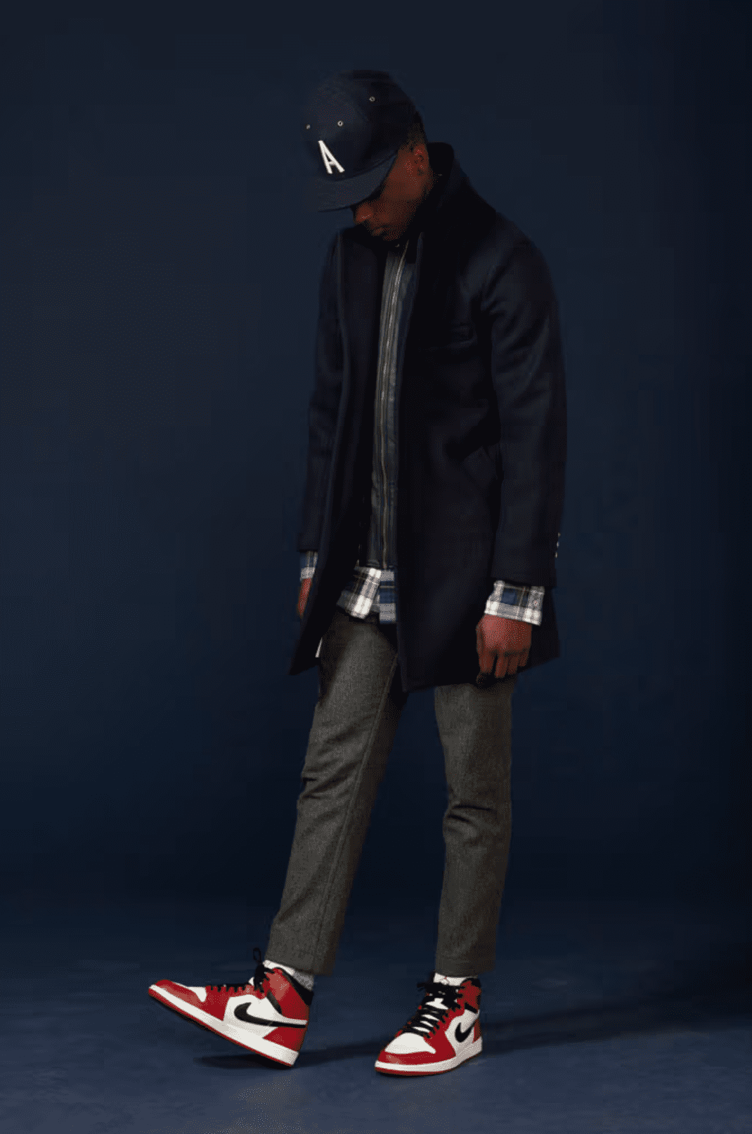 당시의 스트릿 씬의 무드와는 다르게 에임레온도르는 핏한 트라우저 팬츠와 톤다운된 그레이컬러 그리고 볼캡, 신발은 조던을 신는 새로운 코디를 보여줍니다.