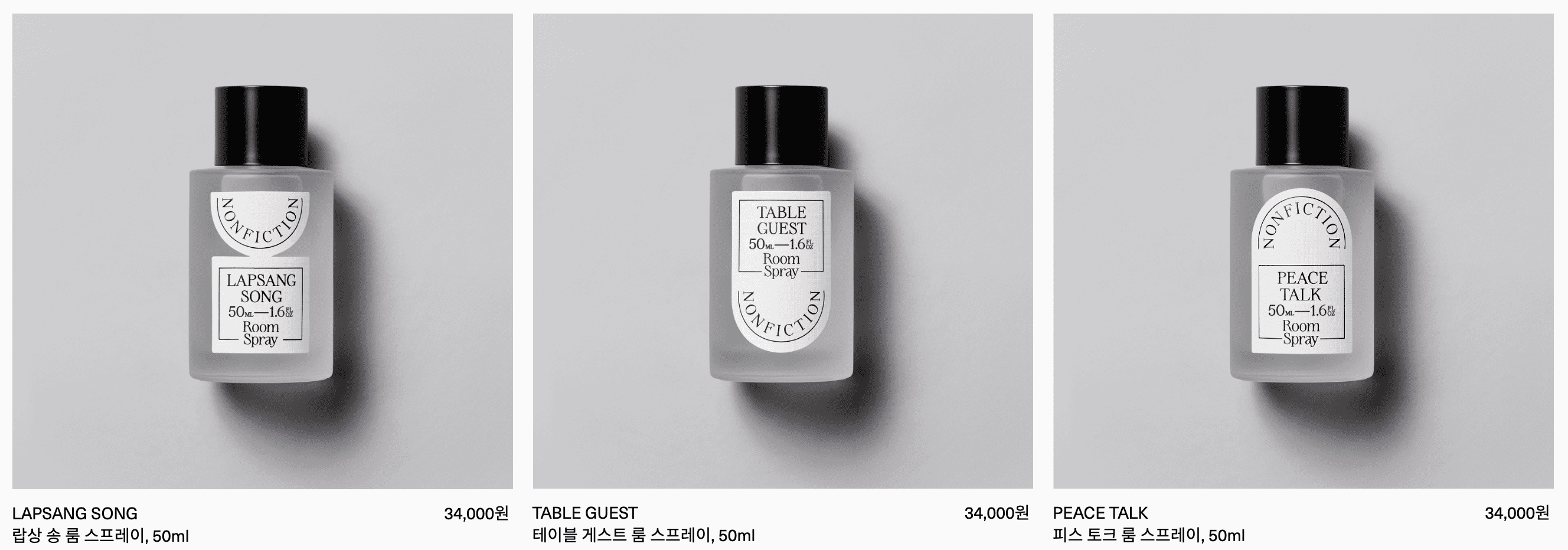 최근 선물용으로 특히 논픽션 룸스프레이를 자주 구매하는데요. 50ml 룸스프레이는 34,000원으로 정말 딱 적당한 가격입니다.
