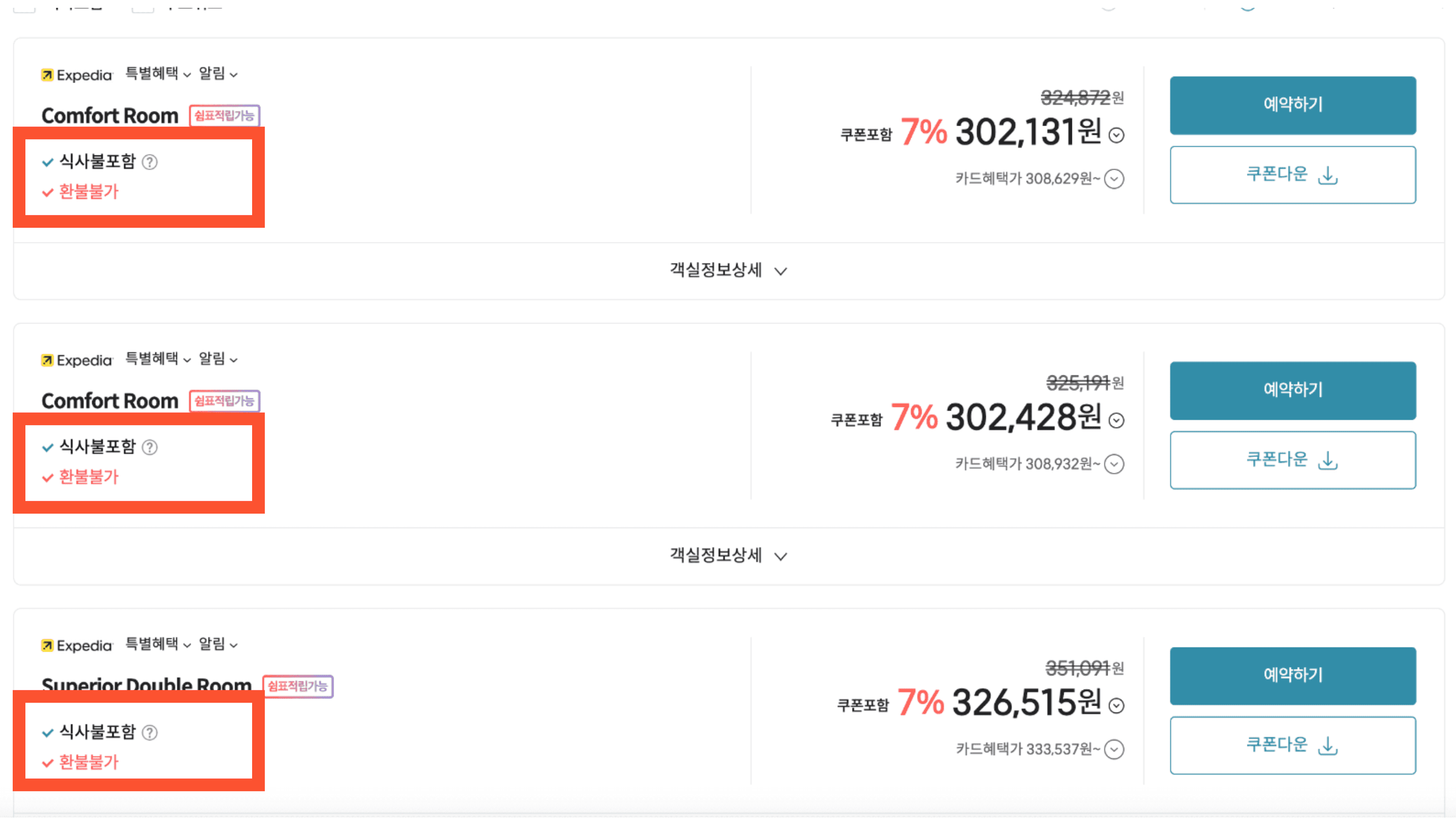놀랍게도 302,131원으로 가장 저렴합니다. 가장 저렴한 표 가격이 노출되는 형태이고, 그런 경우 취소불가한 경우의 가격이 노출되는 경우가 대부분입니다.