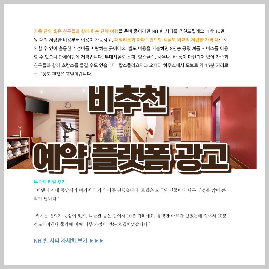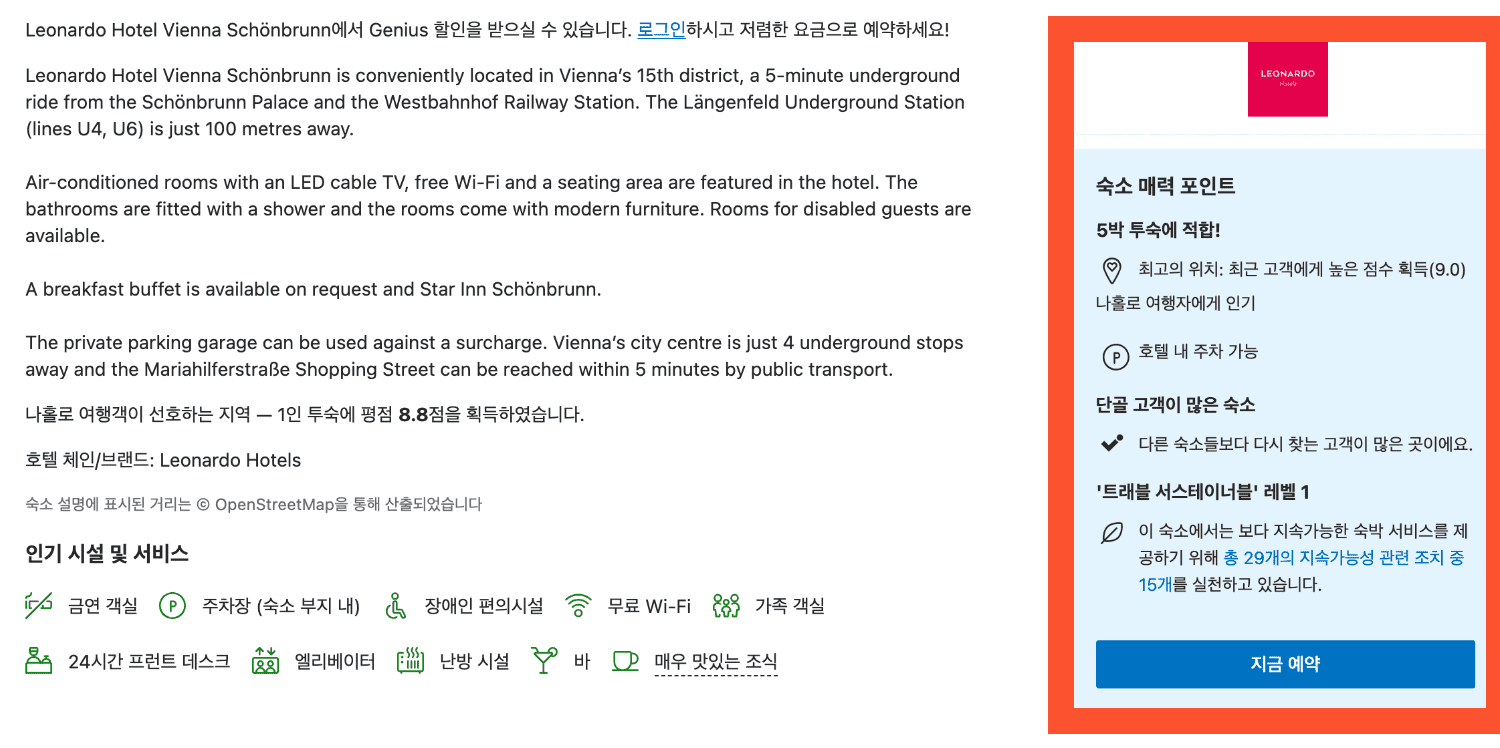 상단의 부다페스트는 호텔을 리스트업 후 실제 예약은 하지 않게 되었습니다. 그 이유는 지인이 부다페스트 거주 중인데, 그곳에서 지내기로 해서입니다. 무튼 상단의 리스트업 작업을 통해서 '레오나르도 호텔 빈 쇤브룬'을 리스트업 해놓았습니다.