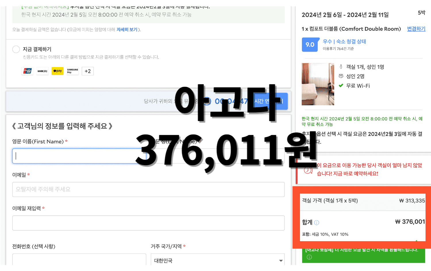 그리고 가장 중요한 포인트! 최종결제금액이 얼마인지 꼭 확인하세요. 이것저것 많이 붙기도 하고 호텔마다 부과되는 금액이 다른 경우가 있습니다. 이렇게 하다 보니 1박 62,667원 즉 단순 계산 시, 5박 경우 313,335원이 나와야 하는데 최종 결제금액은 376,001원으로 나옵니다.