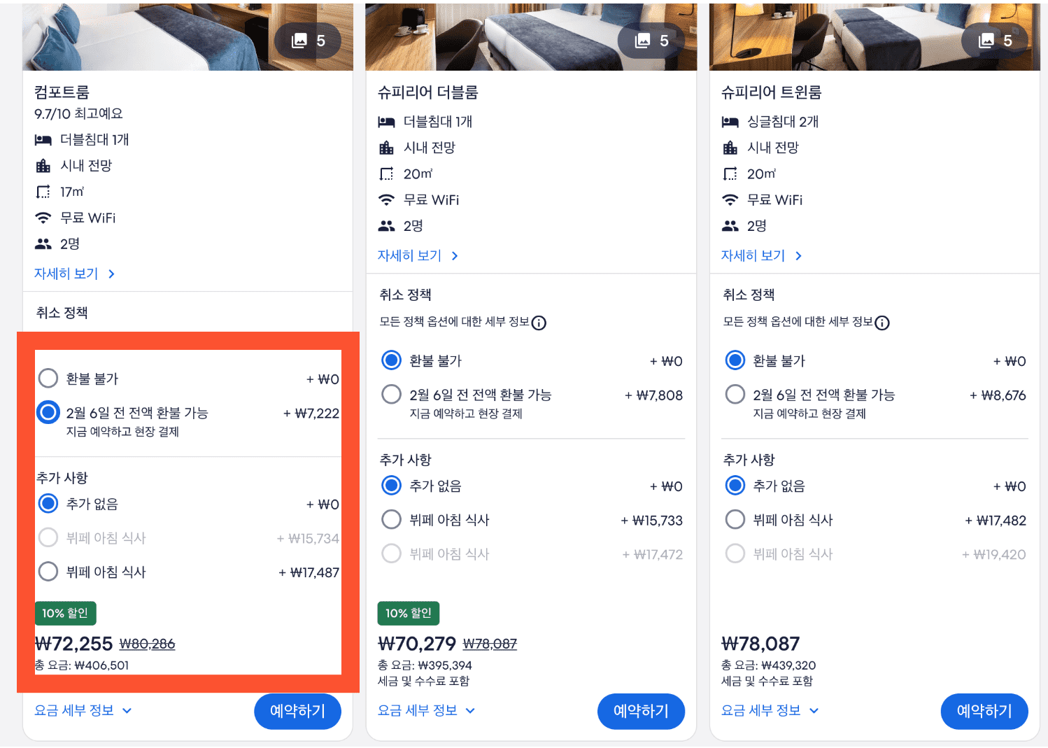 그러나 비교가 불가능합니다. 취소가능하면서 조식이 없는 조건이 없네요. 취소불가에 392,710원이면 확실히 가장 비싼 것은 확실합니다. 취소가능 표가 있었다면, 최소 43만 원 이상이었을 것입니다.