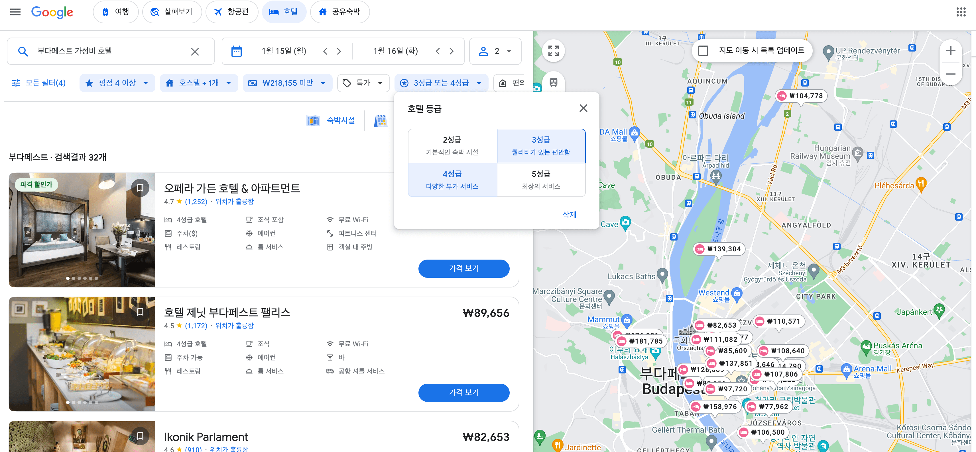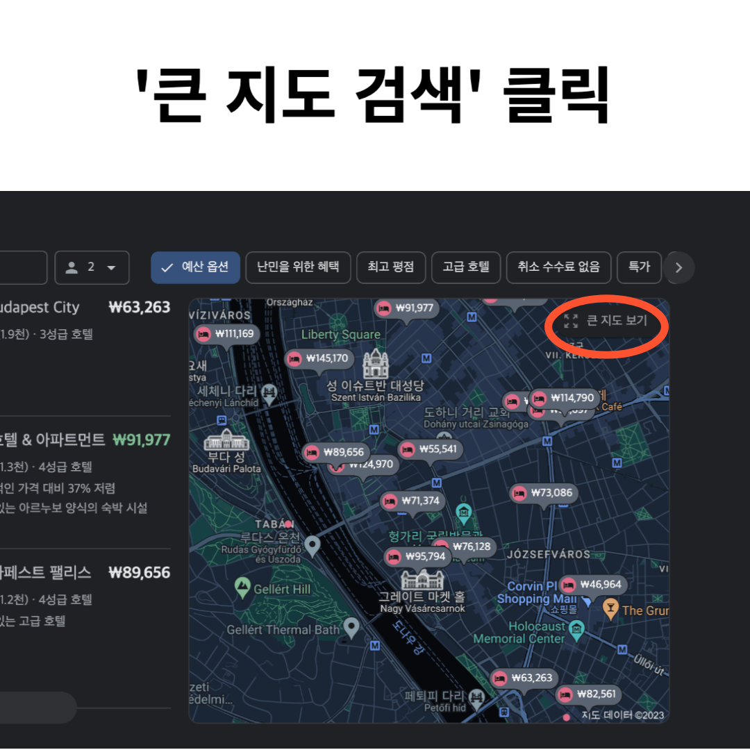 예를 들어, 부다페스트 가성비 호텔 또는 부다페스트 근처 호텔을 검색하면 아래와 같이 호텔과 지도가 나옵니다. 지도 안에서도 리스트를 볼 수 있으니 창표시를 클릭 후, 큰 지도 보기를 클릭합니다.