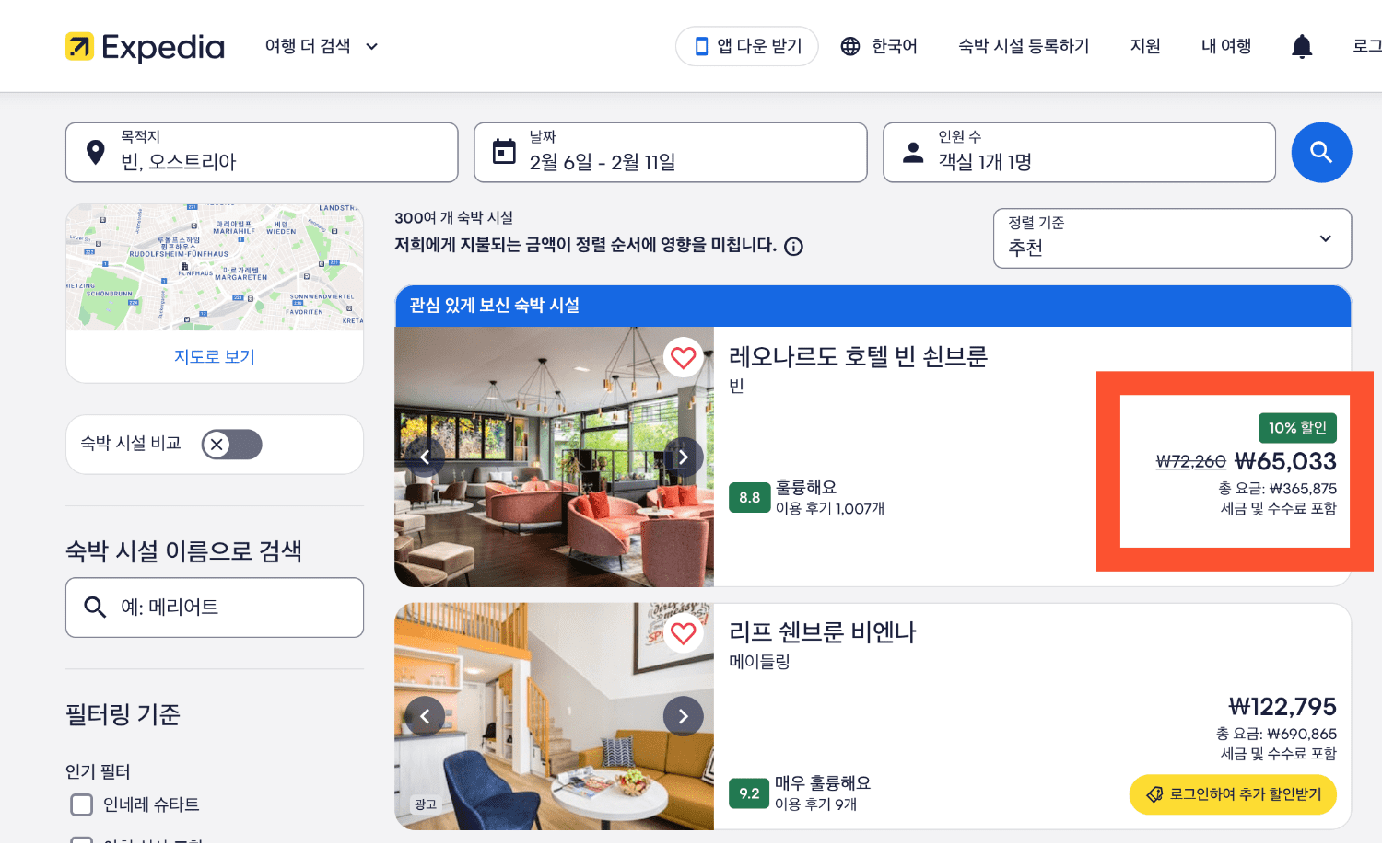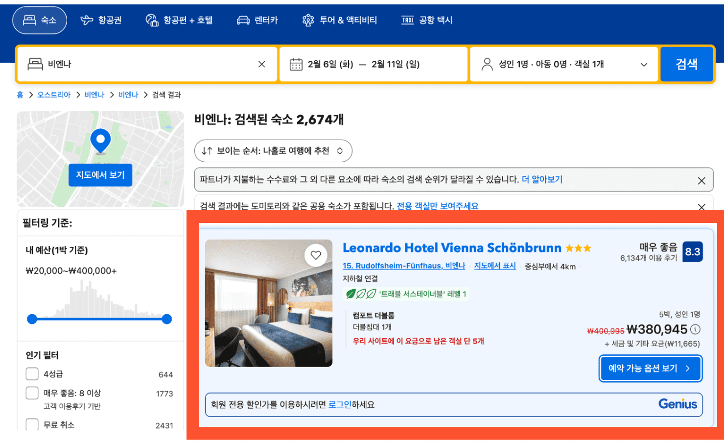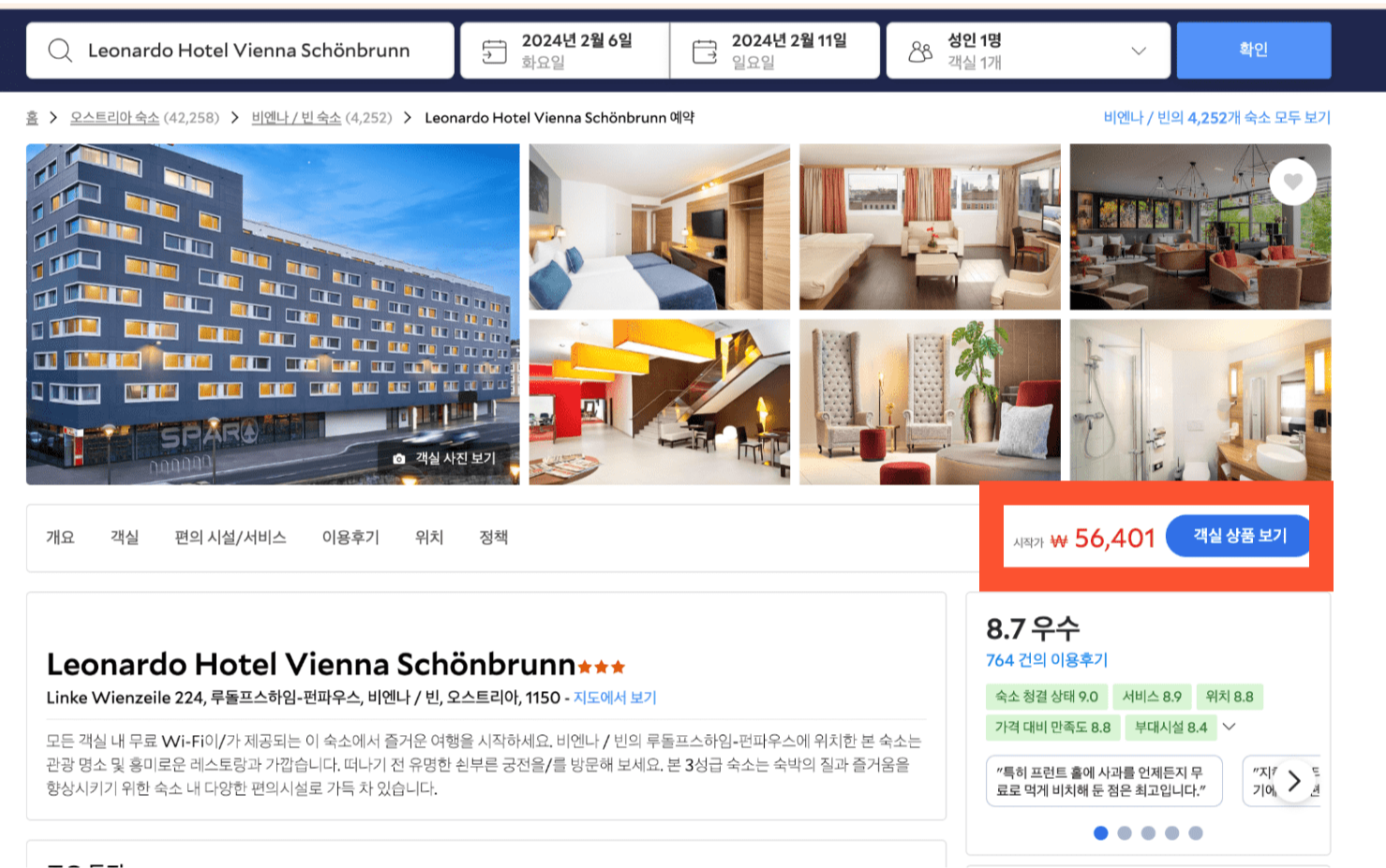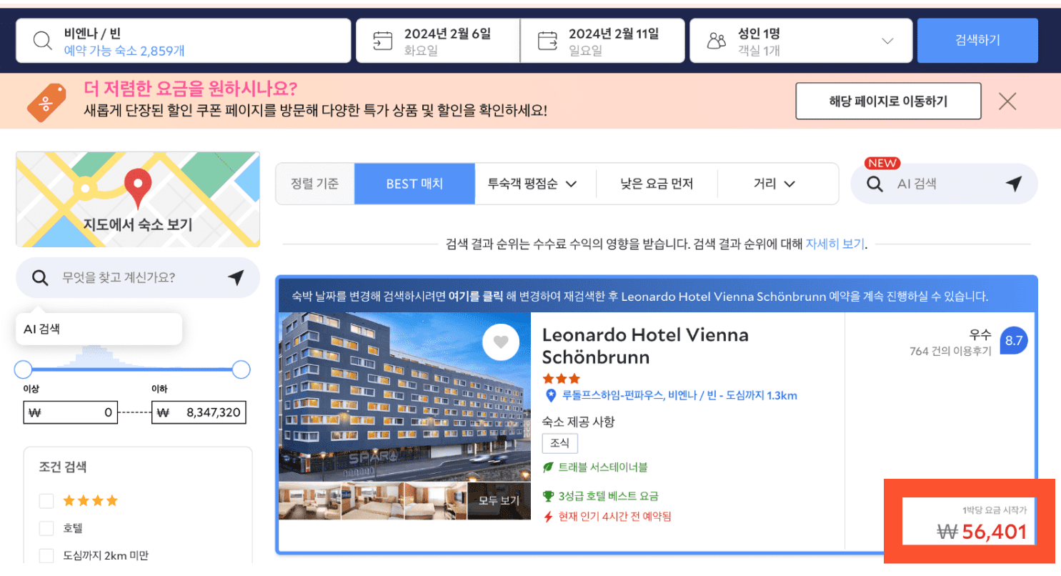 먼저 위에서 확인하던, 레오나르도 호텔 빈 쇤브룬의 최저가를 확인해 보겠습니다.