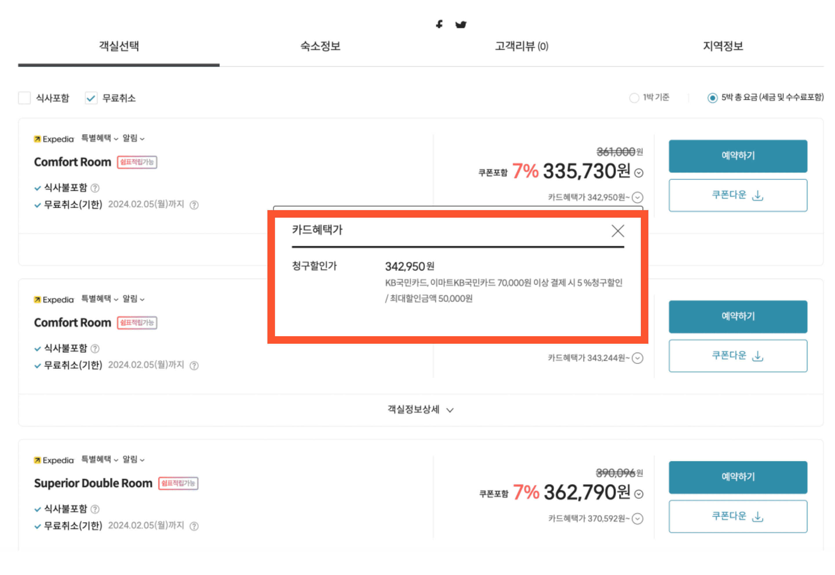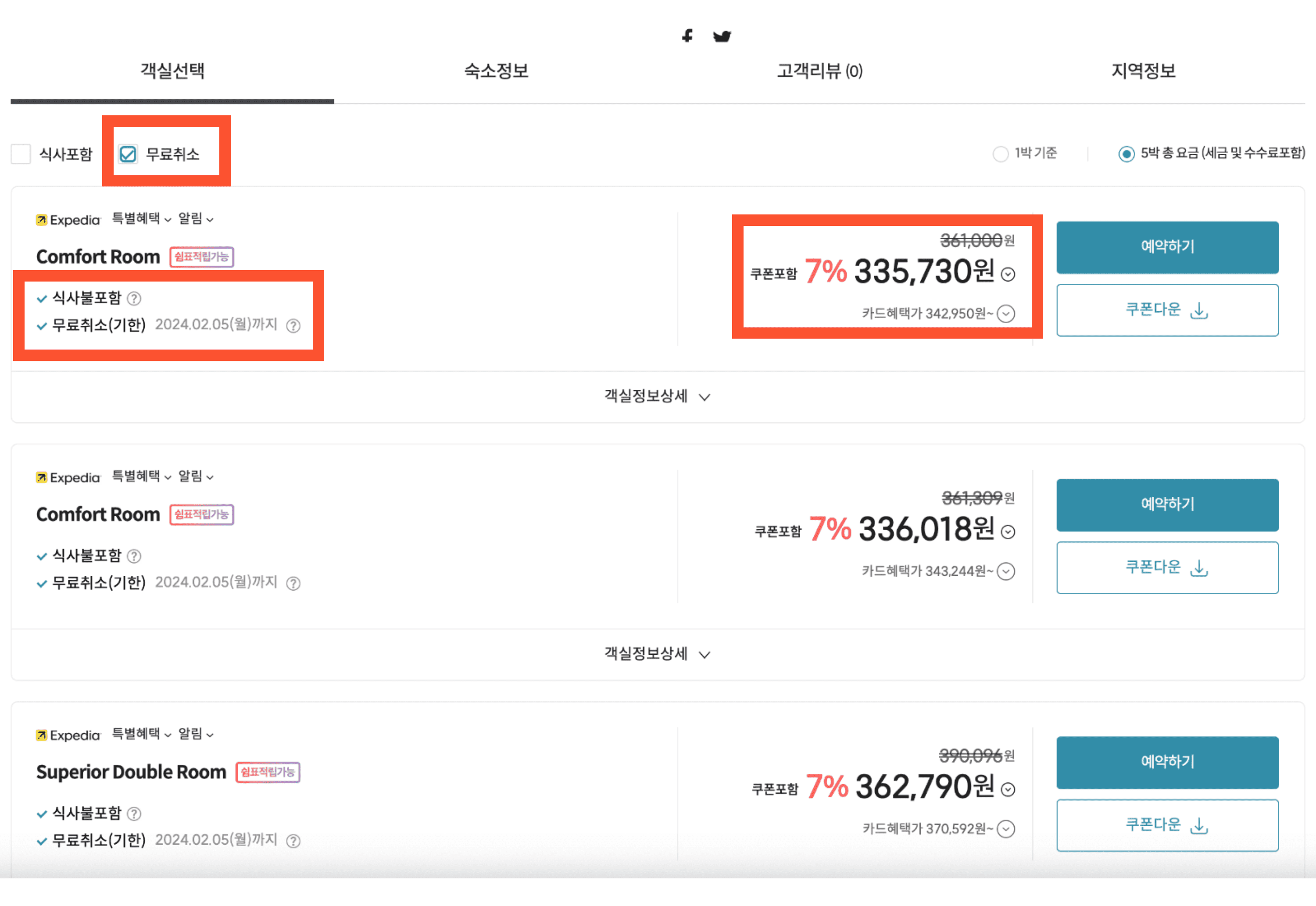 그러나 비교가 불가능합니다. 취소가능하면서 조식이 없는 조건이 없네요. 취소불가에 392,710원이면 확실히 가장 비싼 것은 확실합니다. 취소가능 표가 있었다면, 최소 43만 원 이상이었을 것입니다.