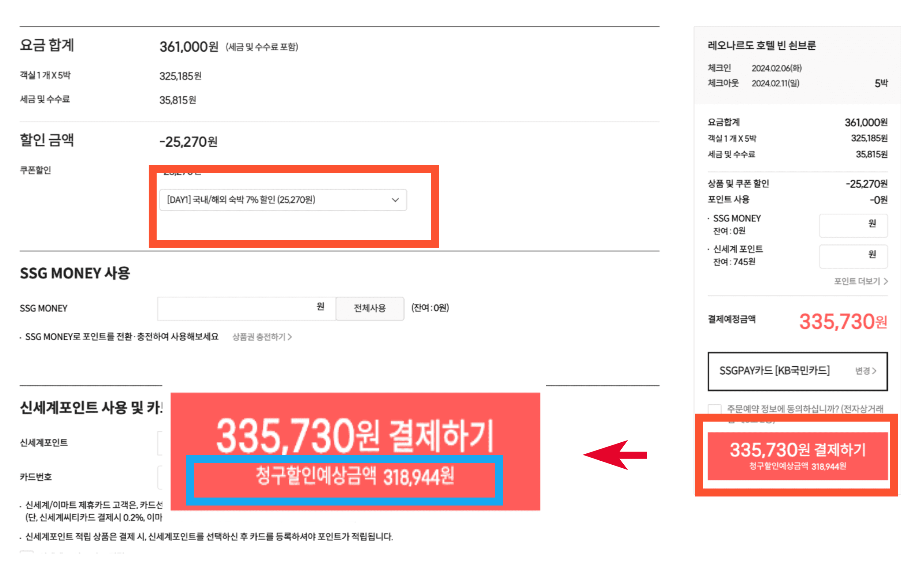 318,944원으로 결제되는 것을 확인할 수 있습니다. 세금포함 1박당 53,157원에 예약하게 되는 격입니다. 아고다, 익스페디아의 쿠폰 등을 먹여 적용해도 이런 가격을 얻을 수가 없습니다.