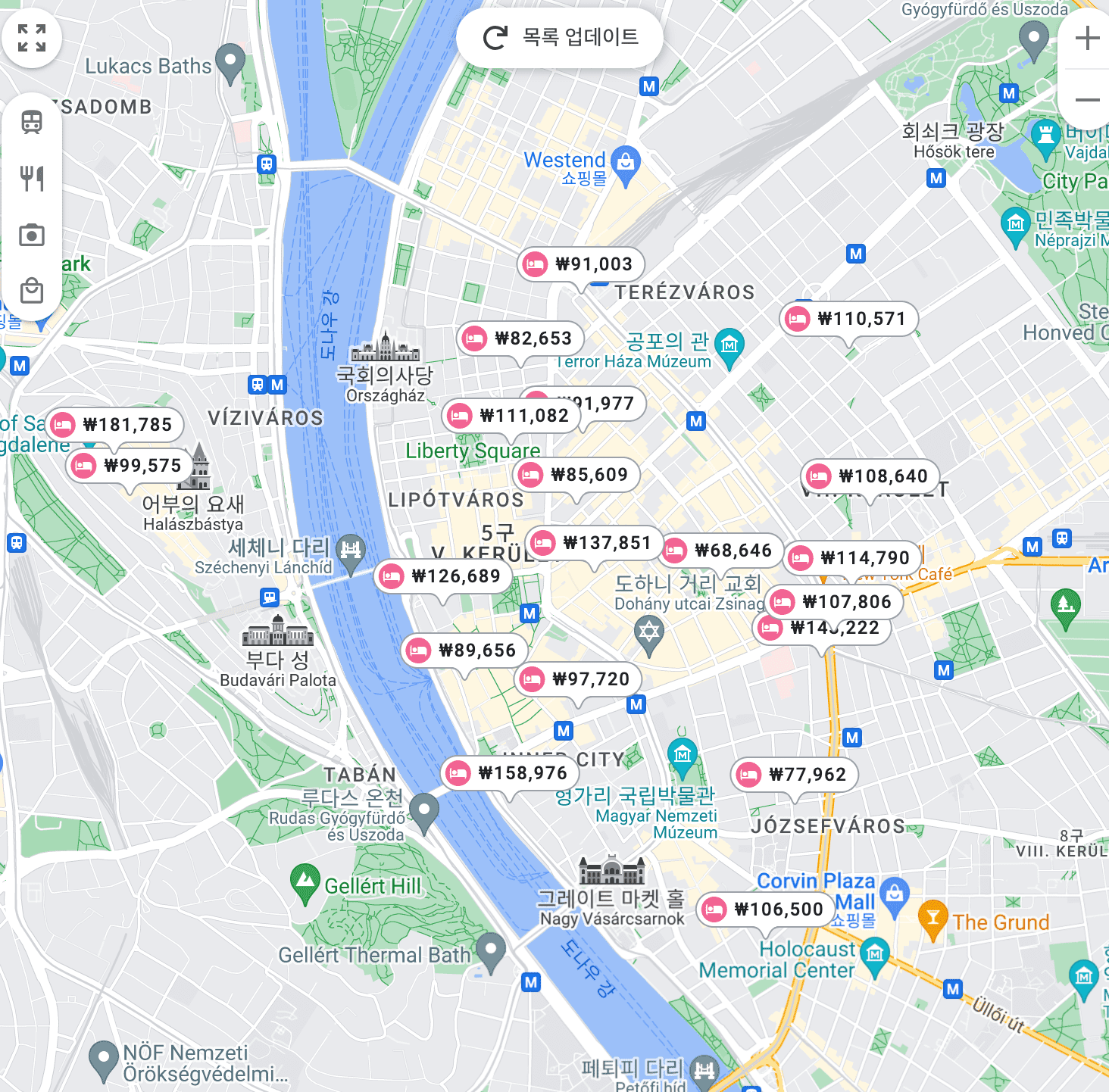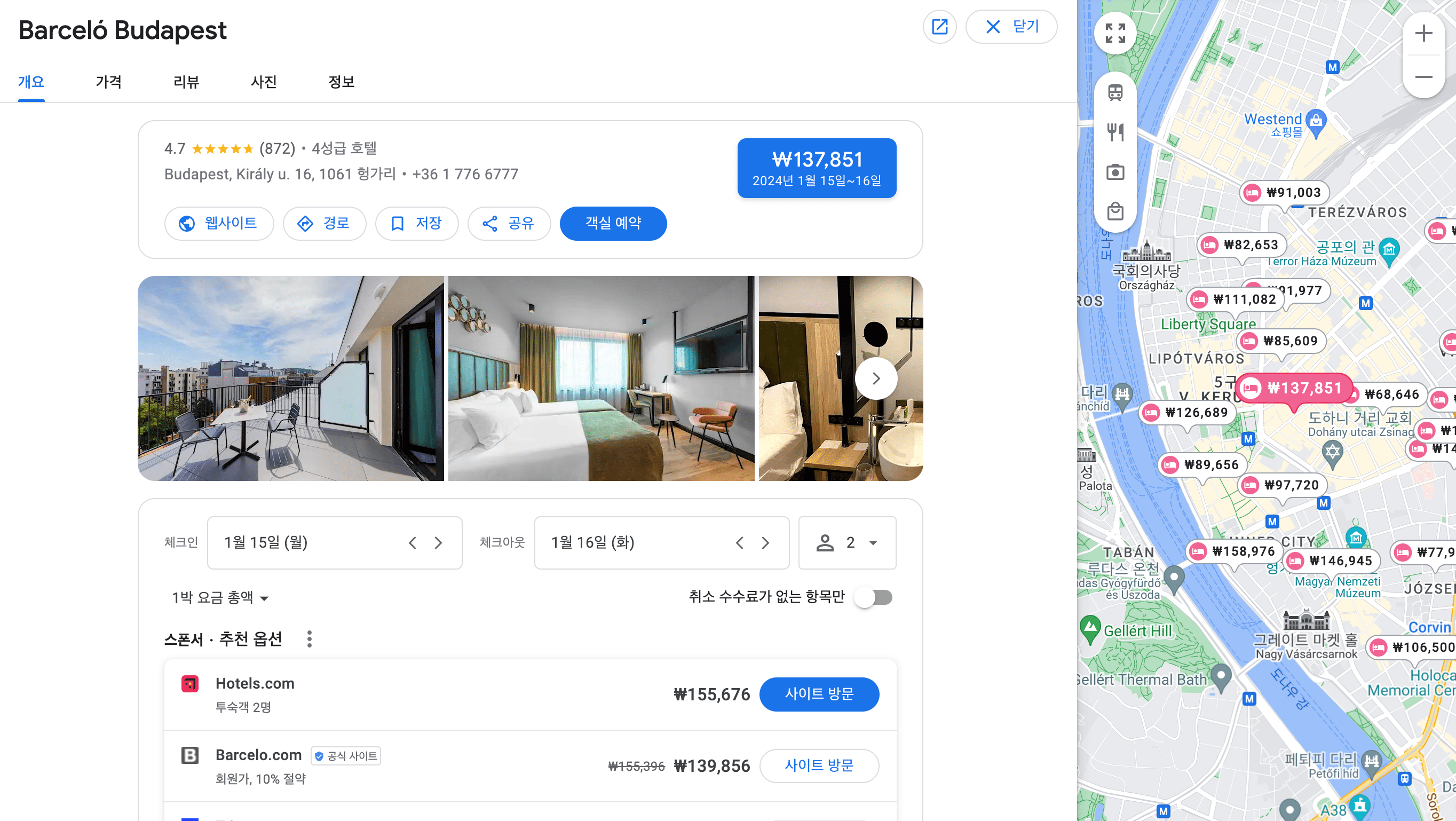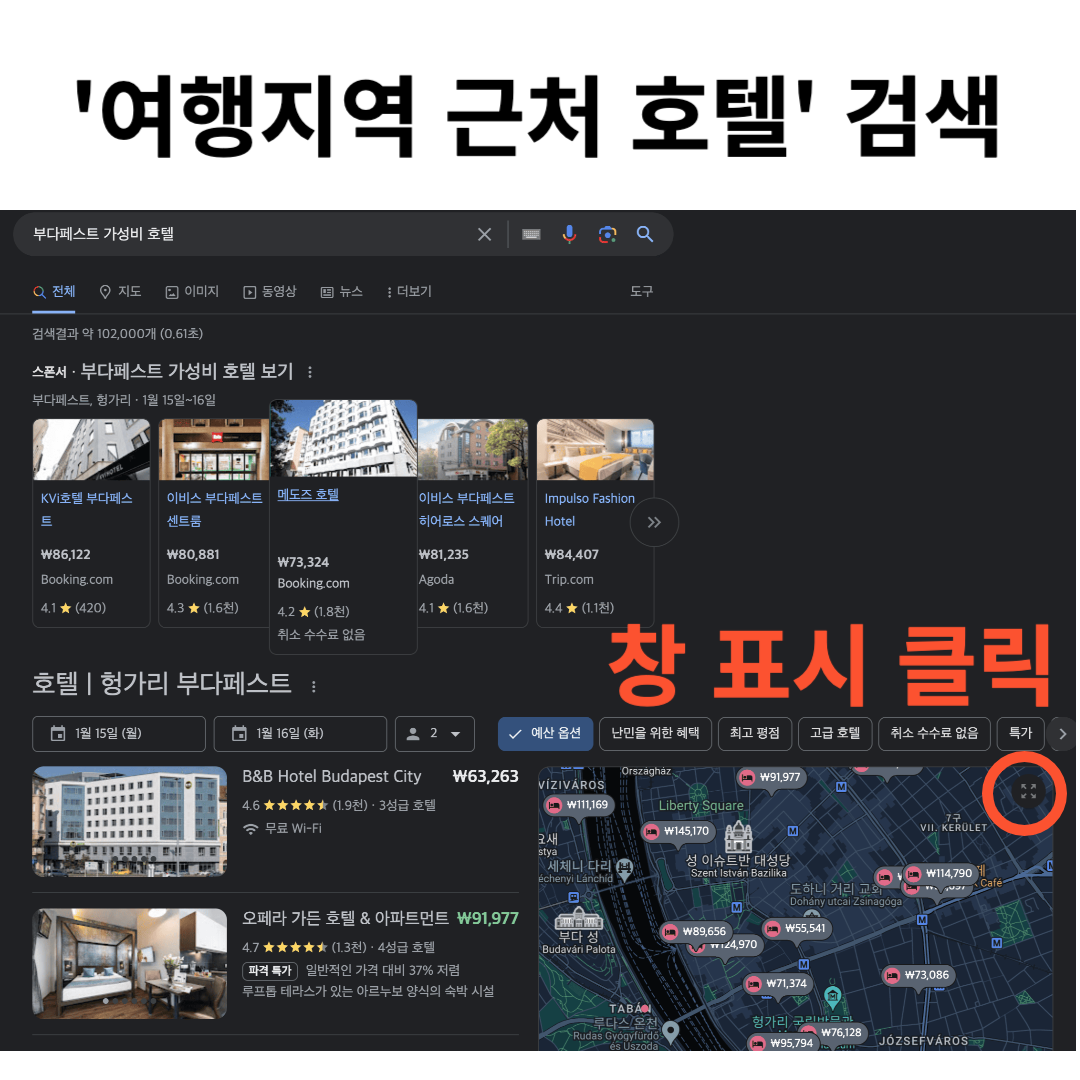 예를 들어, 부다페스트 가성비 호텔 또는 부다페스트 근처 호텔을 검색하면 아래와 같이 호텔과 지도가 나옵니다. 지도 안에서도 리스트를 볼 수 있으니 창표시를 클릭 후, 큰 지도 보기를 클릭합니다.