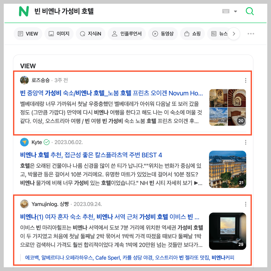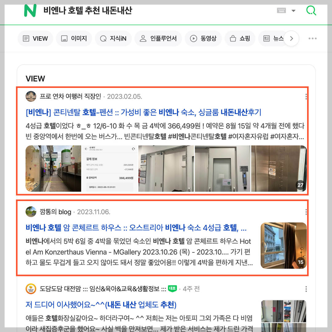 여행지가 유명한 관광지라면 '(지역명) + 가성비 호텔, 호텔 추천, 호텔 리뷰, 호텔 내돈내산' 검색 시 방대한 양의 글이 검색될 겁니다. 광고글이 아닌 후기글로 찬찬히 살펴보세요.
