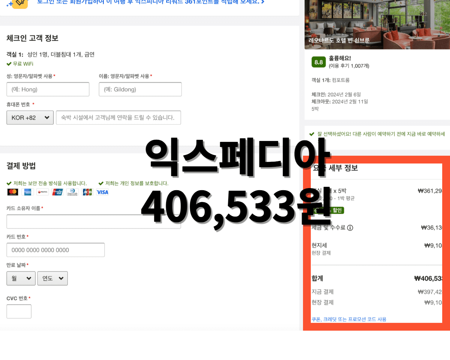 조건을 맞추기 위해, 취소가능한 조건으로 추가합니다. 최종결제가 406,533원입니다. 역시나입니다. 더 찾아볼 것도 없겠죠. 약 3만 원가량으로 아고다 압승입니다.