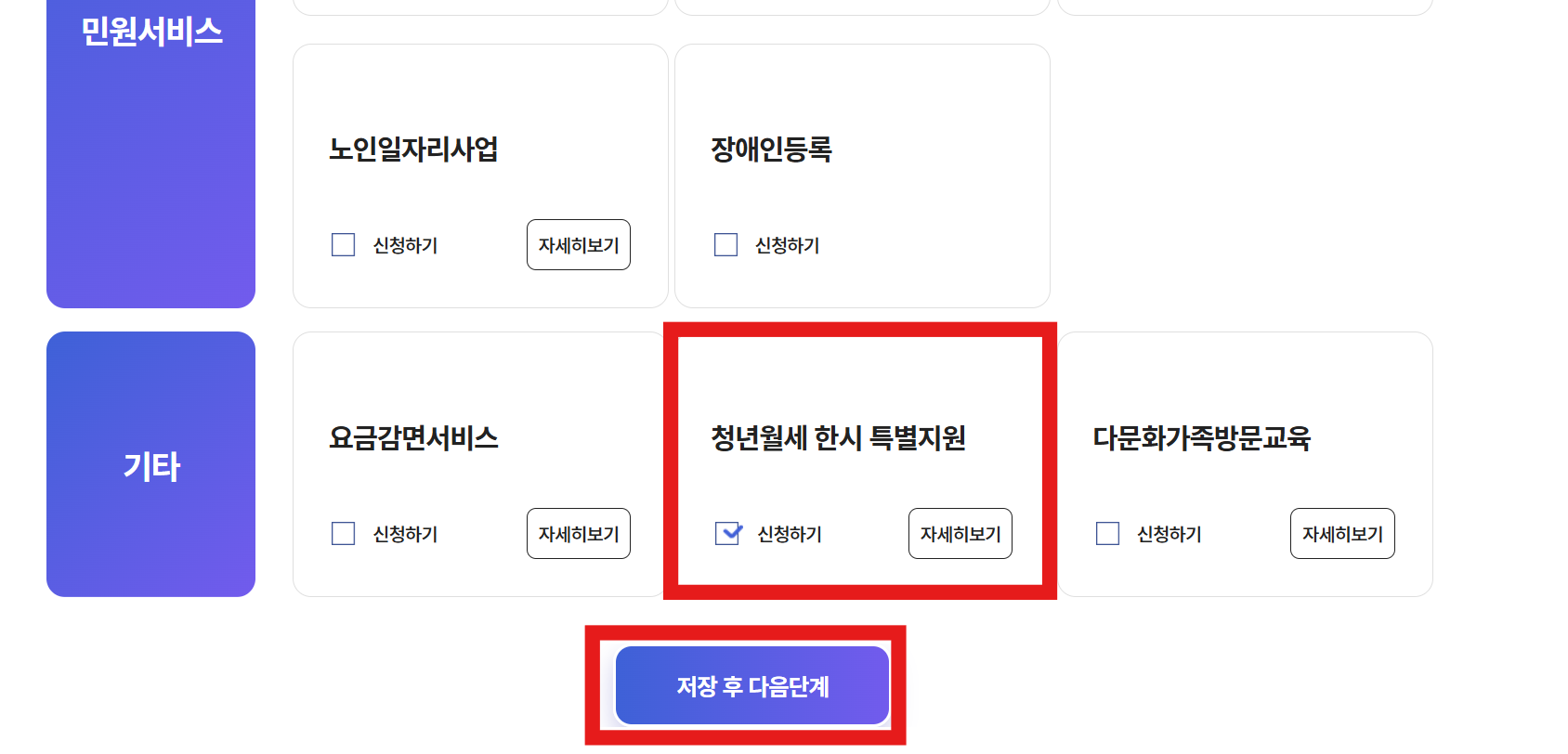 기타란에 있는 청년월세 한시 특별지원을 클릭하고 모두 동의 후 다음을 누릅니다.