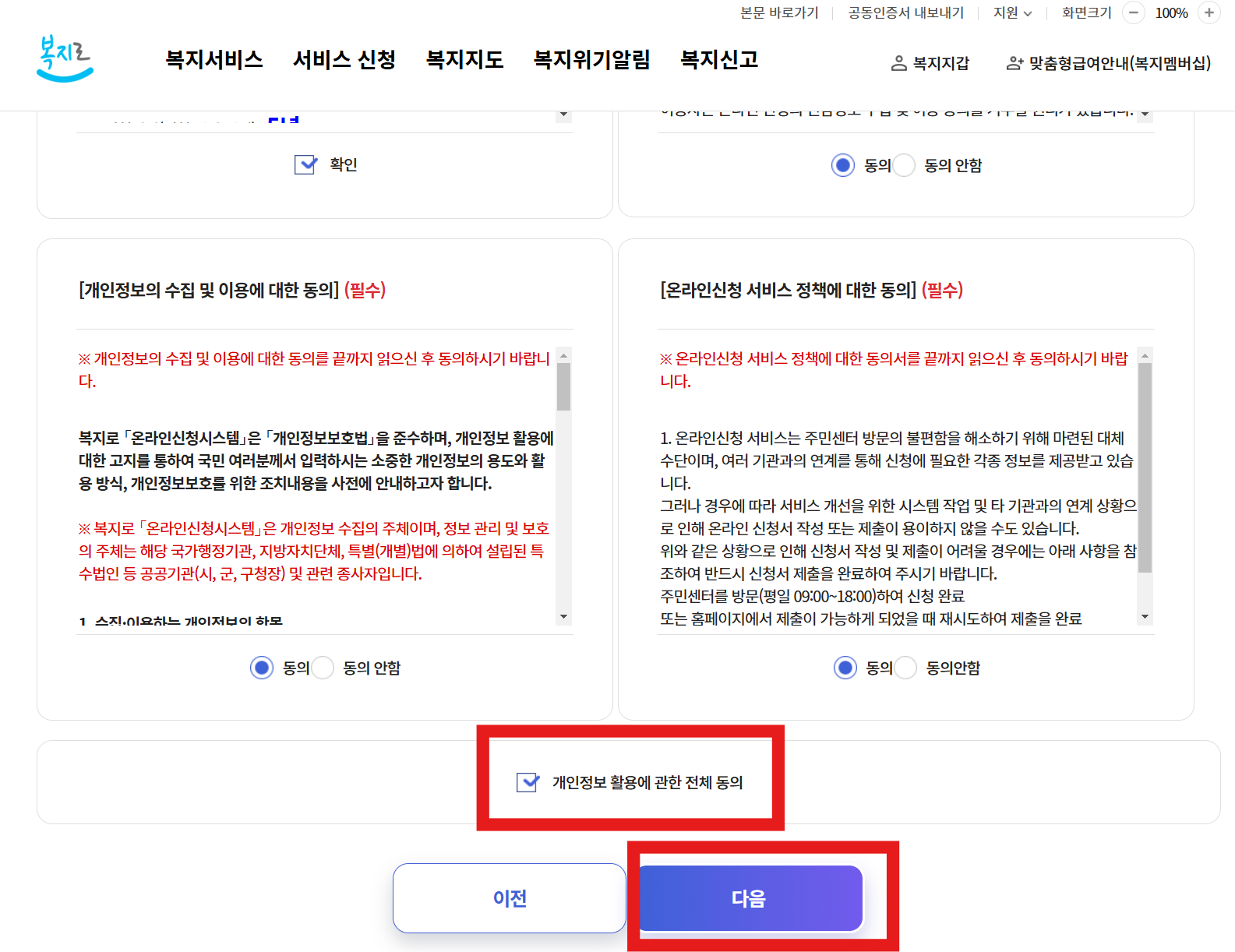 기타란에 있는 청년월세 한시 특별지원을 클릭하고 모두 동의 후 다음을 누릅니다.