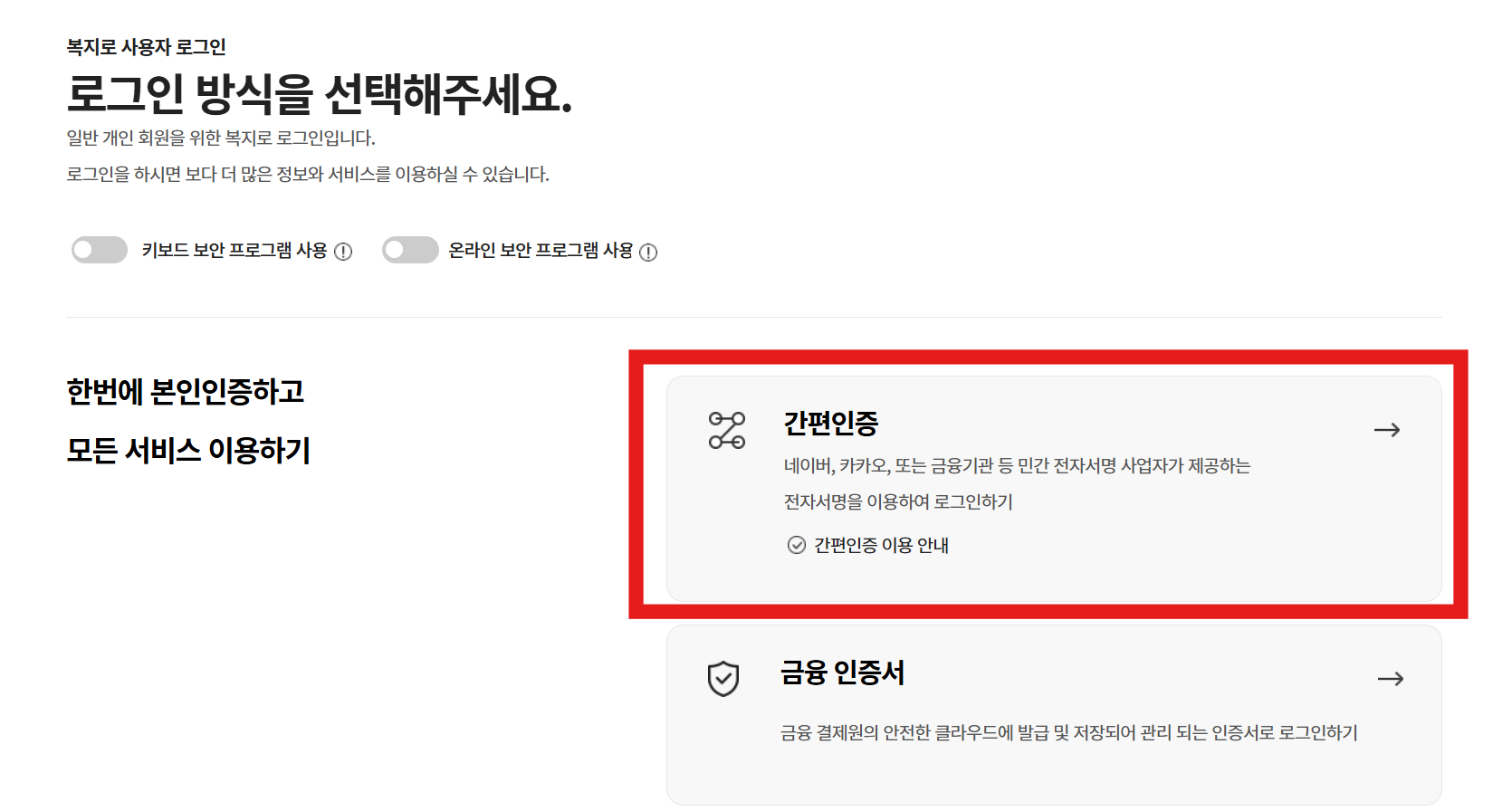 위에 접속하여 복지서비스를 살펴보고 신청하기를 진행합니다. 간편인증으로 로그인을 진행합니다.