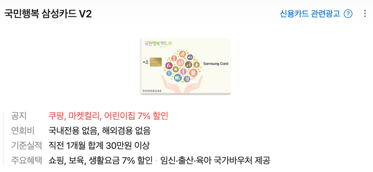 이제 결제일이 얼마 안 남았으니, 삼성카드를 발급해 놓는 게 좋습니다. 종류는 아무 상관없기 때문에 연회비가 없는 [국민행복 삼성카드] 추천 듭니다.