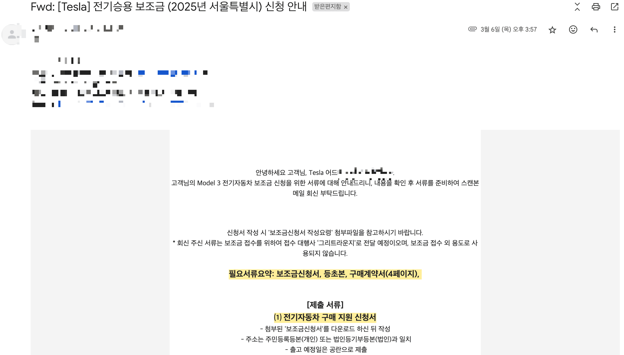 (4) 전기차 보조금 신청을 위한 서류 3개 보내기