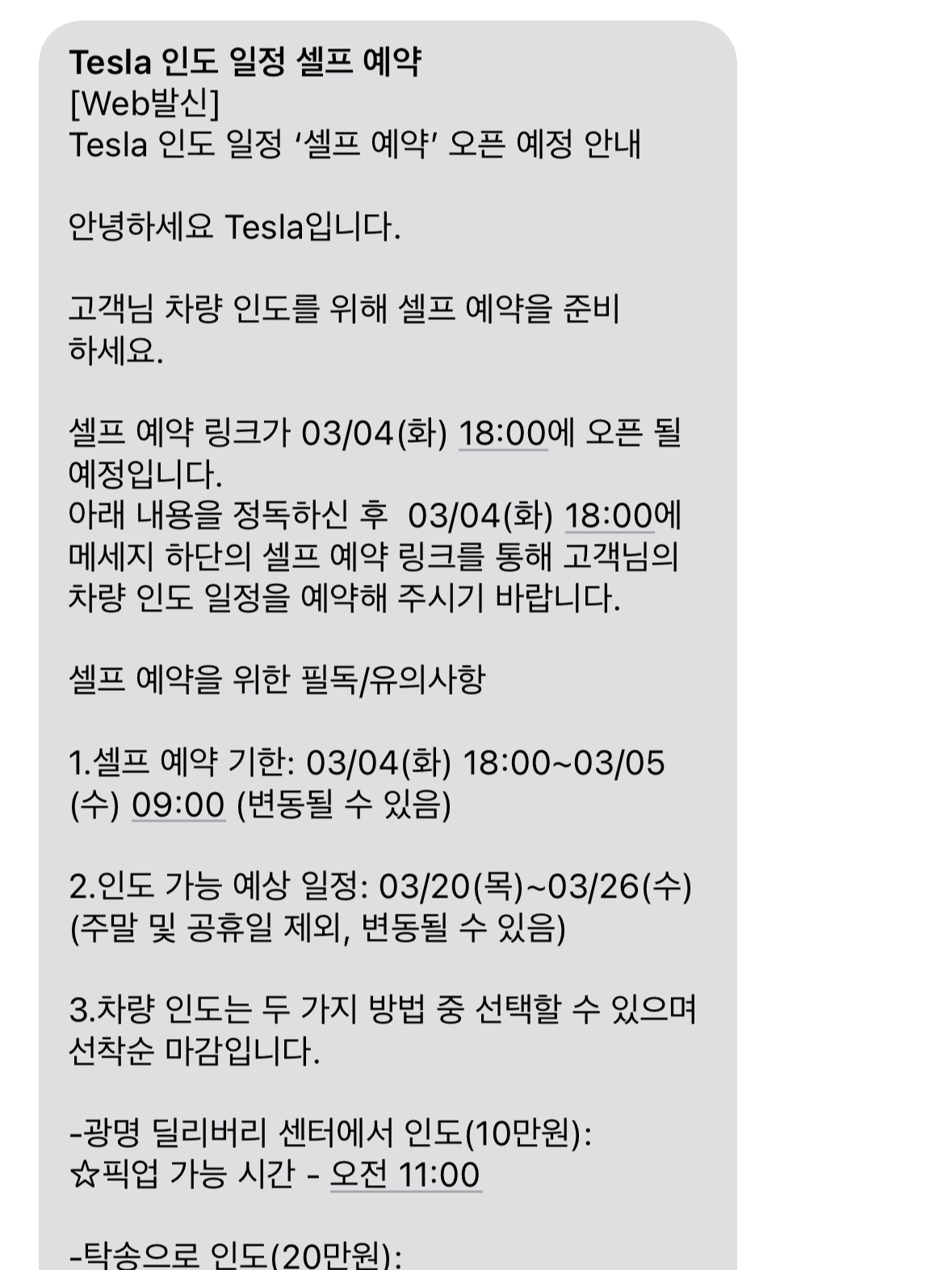 저와 같이 탁송의 경우는 괜찮은데, 직접 광명에 가서 차를 인도받을 시에는 원하는 날에 예약이 꽉 찰 수도 있습니다. 아무래도 휴가를 써서 방문해야 되는 분들이 9할 일 테니 꼭 셀프예약 놓치지 말고 하시길 바랍니다.