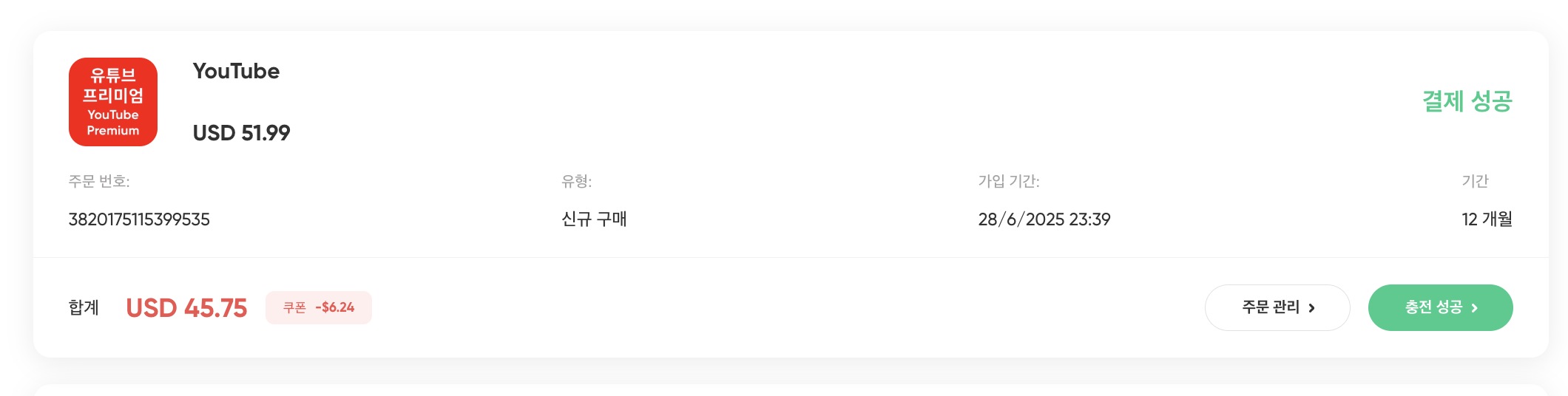 겜스고의 유튜브 대리 충전 서비스는 단순한 할인 이상의 의미가 있습니다. 내 계정을 안정적으로 유지하면서 장기적으로 저렴하게 쓸 수 있다는 점은 큰 장점이었습니다. 저는 개인적으로 매달 결제 알림을 보는 것보다, 1년 단위로 한 번에 충전해 두고 마음 편히 쓰는 게 훨씬 만족스러웠습니다.