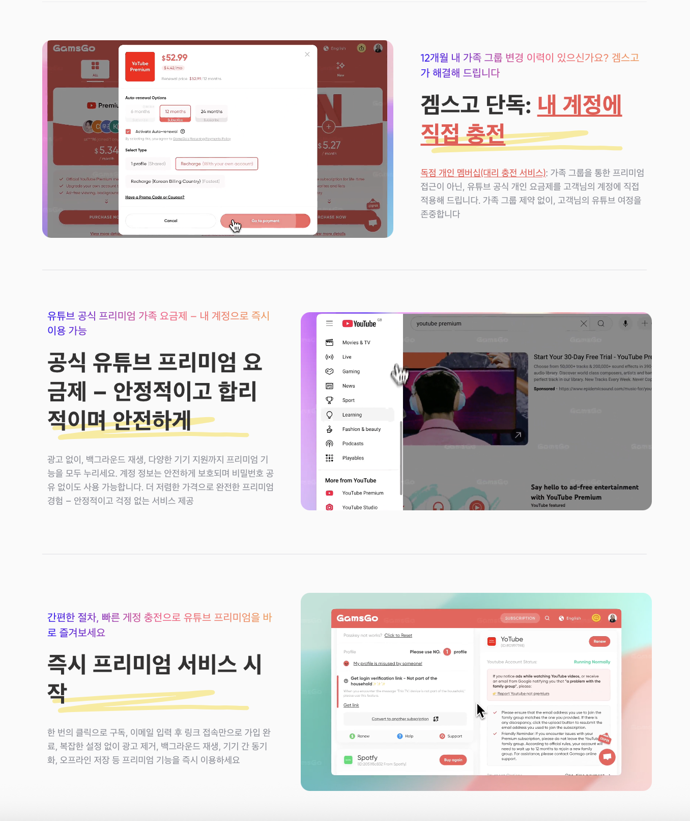 근데, 제가 이번에 말씀드릴 서비스는 이런 고충들을 모두 반영한 '정지 걱정 없는', '최저가로 구독'이 가능한 서비스입니다. 바로 겜스고의 유튜브 프리미엄 대리 충전 서비스인데요.