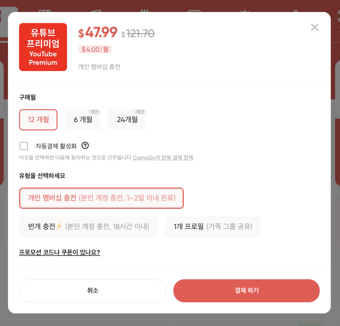 물론 제3자 서비스를 통한 구조라는 점에서 항상 최신 조건 확인은 필수입니다. 하지만 이런 작은 수고만 감수한다면, 유튜브 프리미엄을 훨씬 합리적인 가격으로 안정적으로 즐길 수 있는 선택지가 바로 겜스고 리차지였습니다.