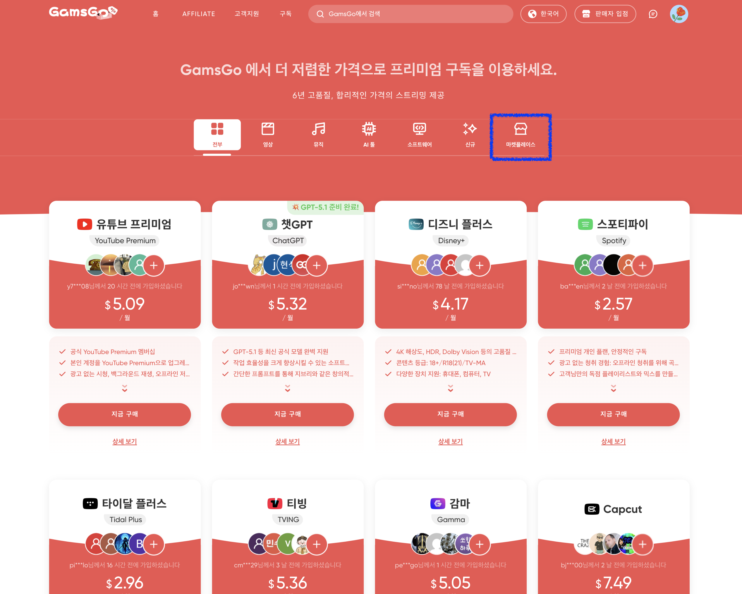 한마디로 정리하면, 겜스고 마켓플레이스는 “겜스고 직판 + 외부 셀러 입점몰”의 투트랙 구조로 확장된 버전이고, 유저 입장에서는 선택 가능한 가격대와 상품 폭이 넓어지고, 셀러 입장에서는 전 세계 유저를 대상으로 디지털 구독을 판매할 수 있는 새로운 채널이 열린 셈입니다.