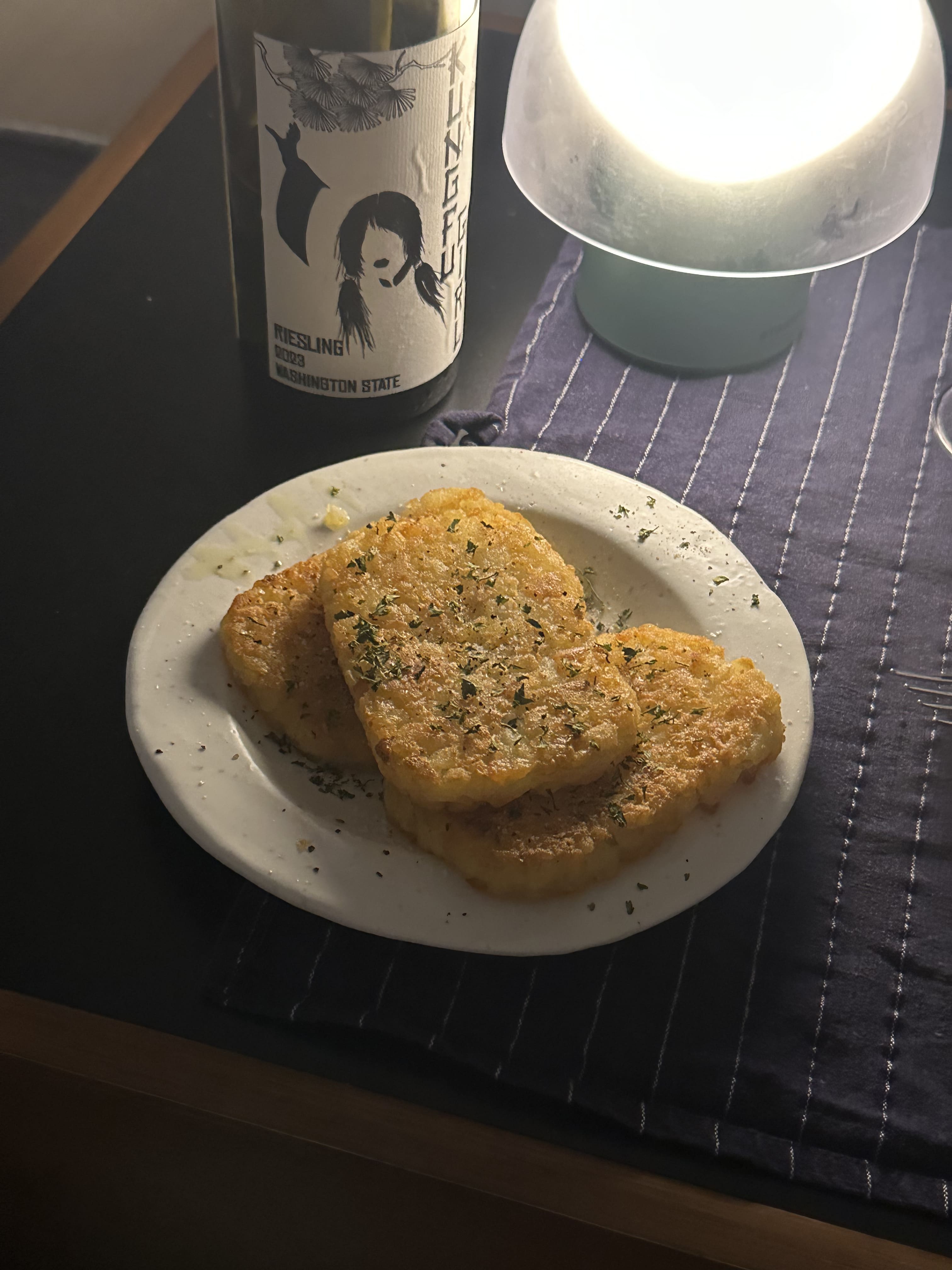 아주 간단하게 먹을 때는 해쉬브라운과 와인을 곁들이기도 합니다. 해쉬브라운의 바삭함 식감과 짭조름한 맛이 쿵푸걸의 달달하면서도 밸런스 있는 바디감, 청량함과 페어링이 상당히 좋습니다.