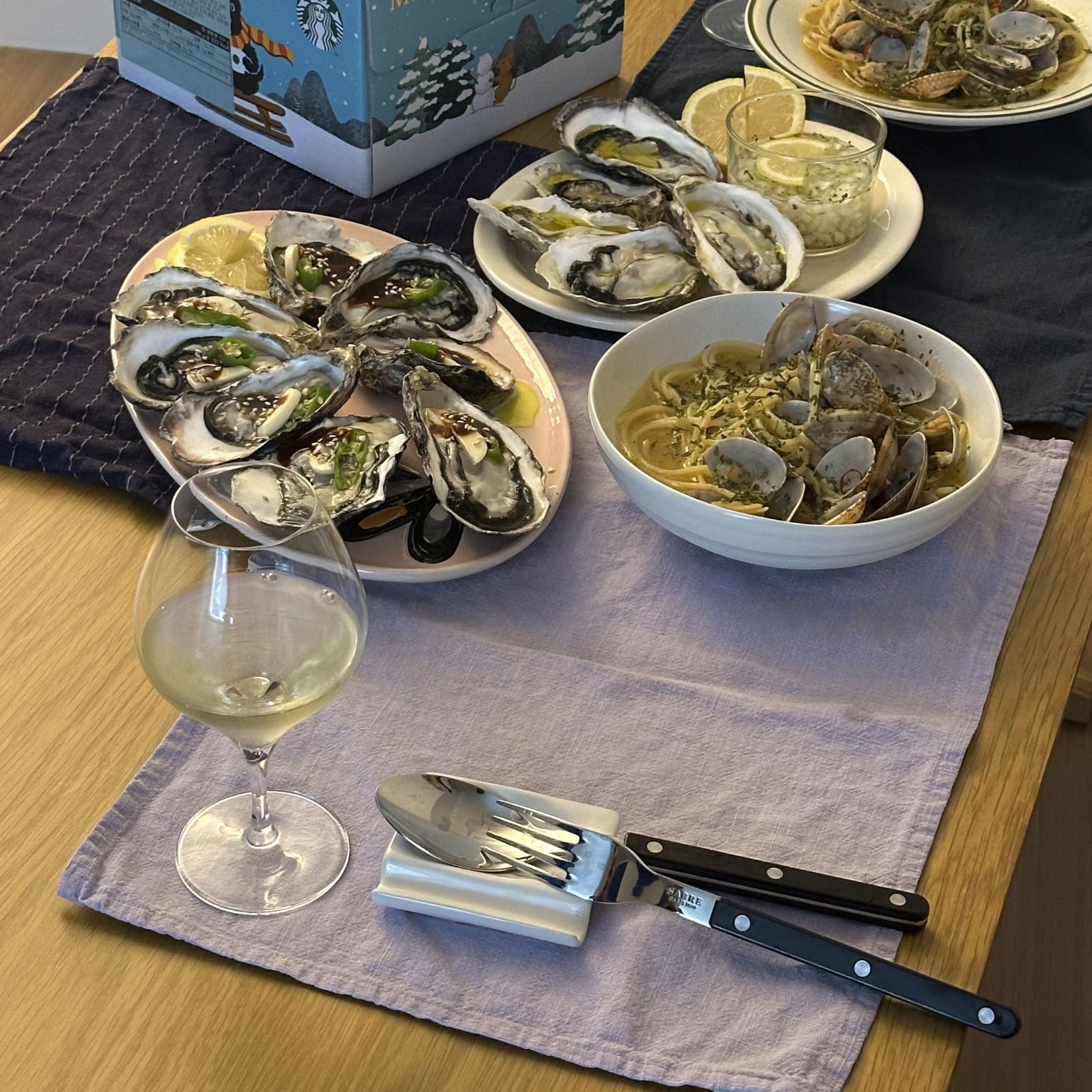 이번 크리스마스 때는 석화와 알리오올리오를 만들어 함께 먹었는데요. 마실 때마다 느끼는 건 좋은 밸런스로 다른 음식들과 잘 어울린다는 생각입니다. 개인적으로 특히 자극적인 음식을 자주 해 먹는데, 고루고루 잘 어울립니다.